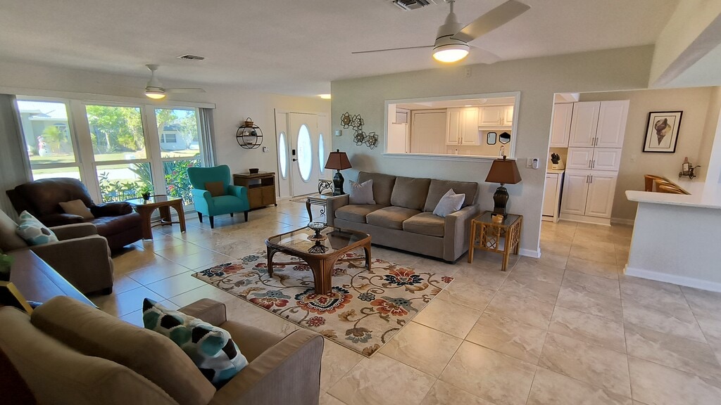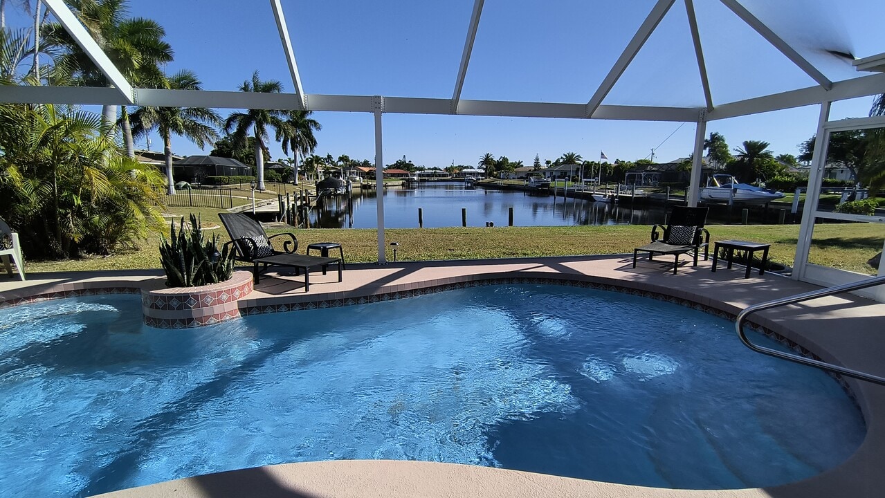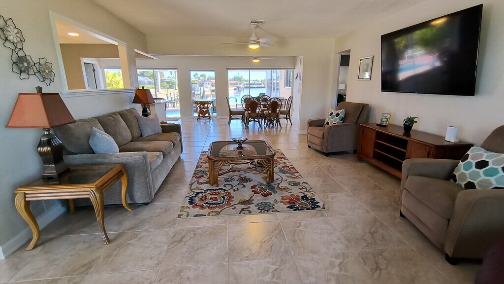 Furnished home with a beautiful, screened pool and waterfront views of the extra wide canal which leads to the Peace River. The open floor plan is light, airy, and spacious. Fish from the dock or bring your boat and take a cruise on the canal which is a few minutes to Fisherman's Village. Located in the upscale quiet retirement community of Punta Gorda Isles and within walking distance or a short bike ride to a host of local parks, Punta Gorda's vibrant historic downtown and the famed Fisherman's village. Living Room 17x 14 with 75"smart tv, and a sofa sleeper couch Dining Room 11 x 11 Kitchen 16 x 8 with bar that seats six. The kitchen is well appointed with dishes, cups, utensils, pots and pans, coffee maker etc... Primary bedroom 14 x 14 with king bed, walk in closet, and 40" smart tv 2nd bedroom is 12 x 10 with two single beds 3rd bedroom / rec room is 21 x 11 with a queen bed, leather couch, table, desk etc... NO SMOKING OF ANY KIND ALLOWED ON THE PROPERTY, or parked trailers / RV's per PGI ordinance Small dogs under 35 pounds allowed with a $300 refundable pet deposit Deposit $1,500 See special offer for discounts, and email for 2027 rates.
