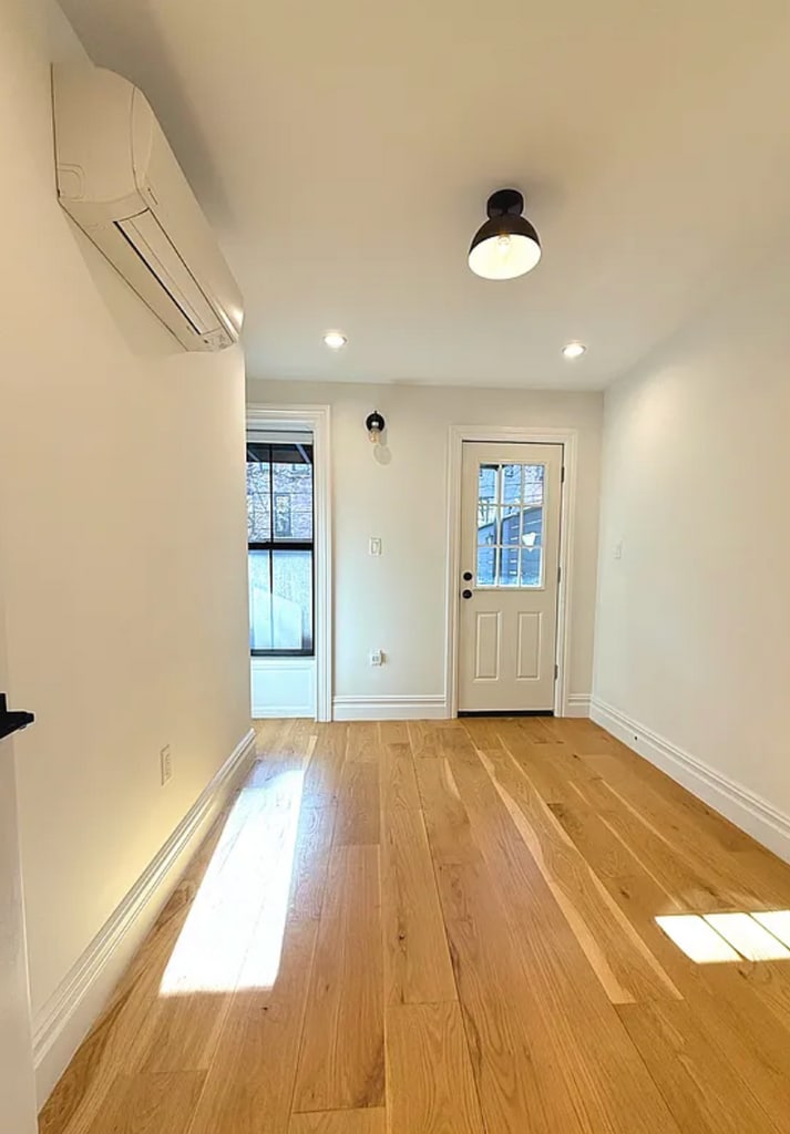 Garden level 1.5 bedroom, 1 bathroom apartment in a recently renovated Brooklyn Brownstone. What we like about it: - Good natural light - 1 bedroom and a second room that could be used as office or guest room - Well appointed kitchen with dishwasher - Washer and dryer in unit - Split system AC / Heat in each of the three living / sleeping spaces - Large closets in both rooms - Electronic video doorbell to communicate with visitors - Quiet block, great community of neighbors - An easy walk to subway (J train on Gates) or bus (B52) and local restaurants and bars on Malcolm X Blvd - Move in ready There is one duplex apartment above which is occupied by a couple who are renters. They have exclusive use of the main garden at the back, the renters of the apartment will have exclusive use of the patio area under the decking above. If you are interested, please email with a little bit about yourself and your availability to see the apartment. No pets (sorry!)