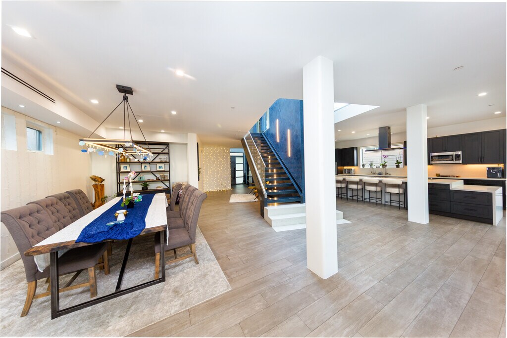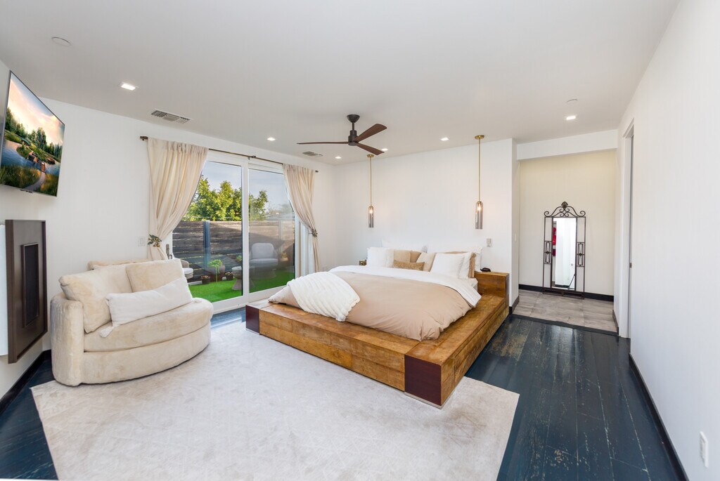 Step into refined modern living in this meticulously crafted family residence located in the heart of Beverlywood. Thoughtfully designed with both luxury and functionality in mind, this exceptional home offers an ideal setting for everyday comfort as well as effortless entertaining. The expansive open-concept layout is enhanced by soaring ceilings and skylights, filling the interiors with abundant natural light. The striking exterior features handcrafted Shou Sugi Ban wood, delivering timeless architectural appeal and exceptional durability. A whole-house water filtration system provides purified water throughout, adding an elevated layer of comfort and wellness. At the center of the home, the chef's kitchen is equipped with top-of-the-line Miele appliances, an impressive 16-foot island, walk-in pantry, and a dedicated baker's marble counter. Oversized sliding glass doors create a seamless indoor-outdoor connection, opening to a private backyard complete with a half basketball court, built-in concrete seating, and a fire pit, perfect for gatherings and relaxation. The main living area flows effortlessly and is anchored by a 6.5-foot fireplace, creating a warm and inviting ambiance. Upstairs, four en-suite bedrooms provide private retreats, complemented by a versatile bonus room ideal for an office, playroom, or art studio. Three outdoor patios extend the living experience, including stunning Hollywood Sign views from the primary suite. The luxurious primary retreat features its own fireplace, walk-in closet, and a spa-inspired bathroom designed for ultimate relaxation. Additional highlights include built-in garage storage and a prime location just steps away from Canfield Elementary School. A rare opportunity to lease a thoughtfully designed modern home in one of Beverlywood's most desirable neighborhoods. Can be furnished for an additional fee.