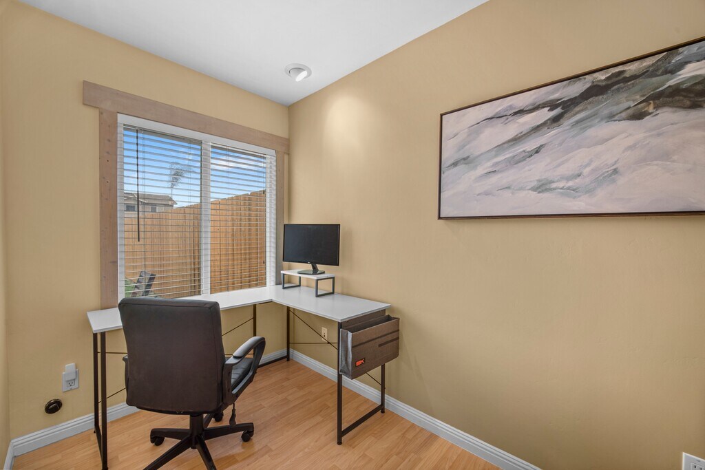 Fully furnished 2 bedroom home with big private backyard good for bbqs and a dog. King bed in the primary room and double bunk beds in the other room. Office area in bedroom and high speed internet, Rocu tis in the living room and both bedrooms.Washer and dryer and dishwasher. We think of everything you need to live comfortably. Alls you really need to bring are clothes and personal items Hope to show you are wonderful fully furnished home. This home just added upgrades a new bathroom vanity and shower door, kitchen cabinets refinished and bbq and outdoor furniture pack n play plastic dishes and highchair.