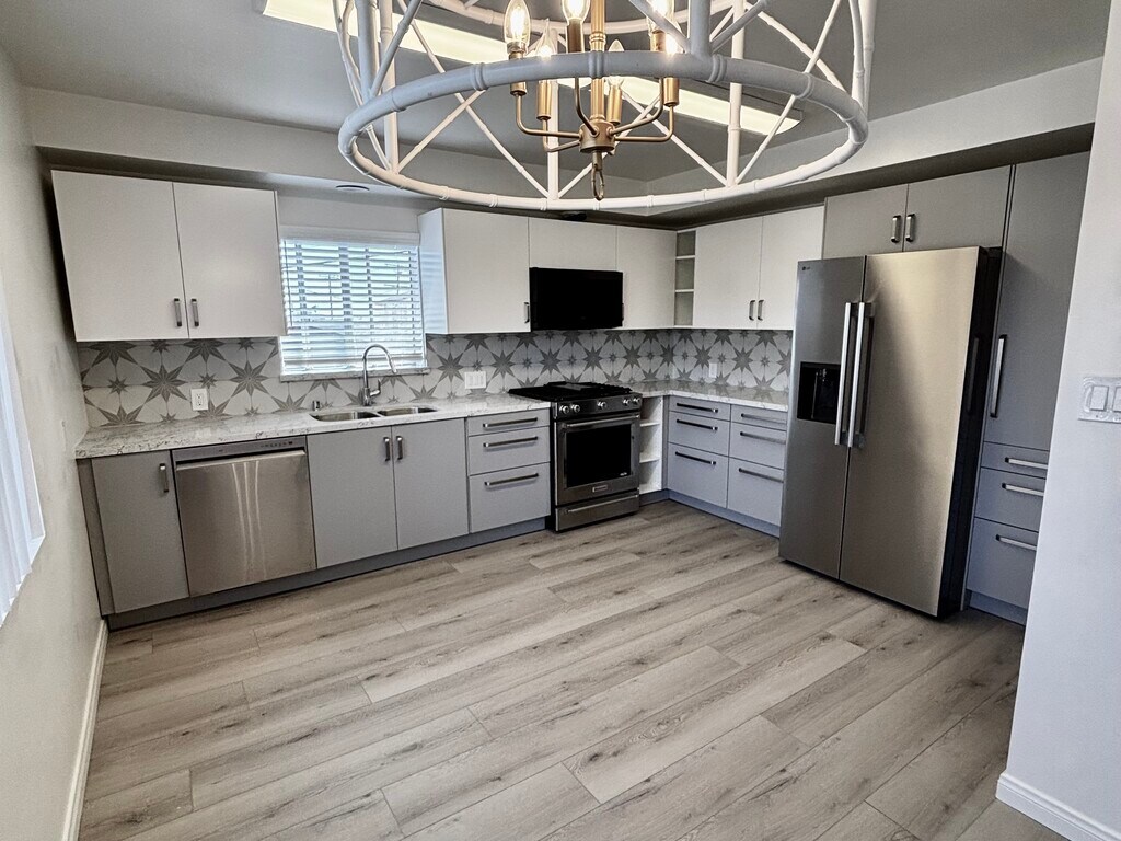 Completely remodeled upper unit available now! This beautifully updated home features a brand new large kitchen and a dining area with new cabinets, countertops, high-end appliances, modern finishes, and ample space for cooking and dining. The bathroom has also been fully renovated with a new tub, vanity, toilet, offering a fresh and stylish feel. Enjoy new flooring, carpet and paint throughout creating, creating a clean and inviting living space. The unit includes two spacious bedrooms, one full bathroom, a large kitchen with an eating area, and a comfortable living room perfect for relaxing or, entertaining. Additional features include a dedicated laundry room downstairs with washer and dryer hookups. This move in ready unit combines modern upgrades with practical living-don't miss out! Properties remodeled to this standard lease quickly. Schedule your private showing today and experience it for yourself. Please call Nick at for all showings and inquiries.