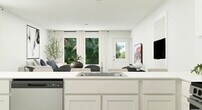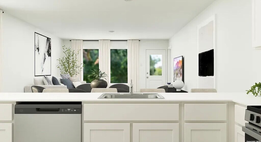 This 3-bedroom, 2-bathroom single-story home offers approximately 1,402 sq ft of living space and features new construction with an open-concept Kitson floorplan. The home includes a primary suite with an en-suite bathroom and walk-in closet, along with a glass sliding shower door in the primary bathroom. There are two secondary bedrooms, ceiling fans in all rooms, and central air and heating throughout. The kitchen is equipped with a stove, oven, dishwasher, and refrigerator, along with a breakfast bar and open living/dining area. A washer and dryer are included for added convenience. Flooring consists of carpet and vinyl. The property also features a two-car attached garage with driveway parking, a private fenced backyard, and landscaping is included. Residents have access to community amenities including a pool, 24-hour fitness center, and activity center. The home is zoned to Northside ISD and is located in the Waterwheel community.