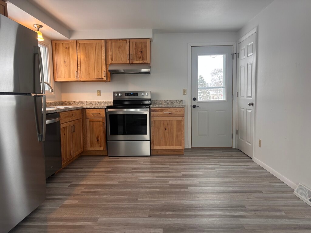 This freshly remodeled two bedroom duplex sits on a spacious half acre lot with a large backyard. located on the north side of Brodhead, it offers a peaceful country setting while still being close to town. The home features a full bath, full kitchen , and a full basement, with updates including new kitchen cabinets, appliances , carpet ,flooring throughout.