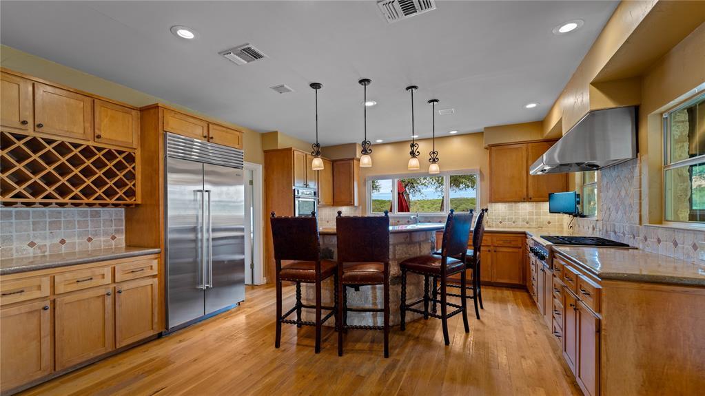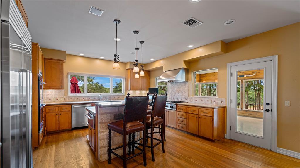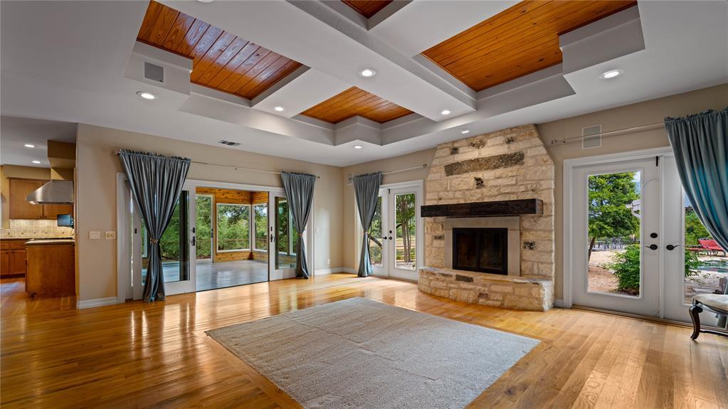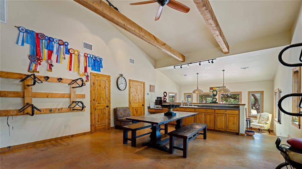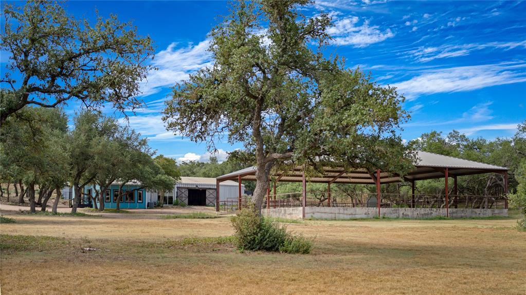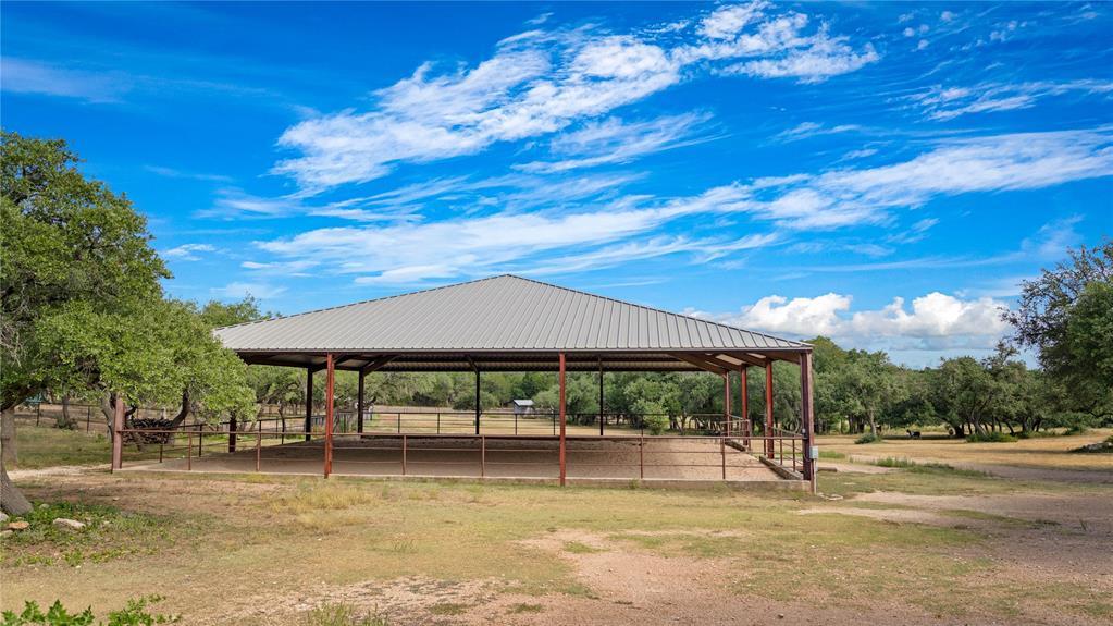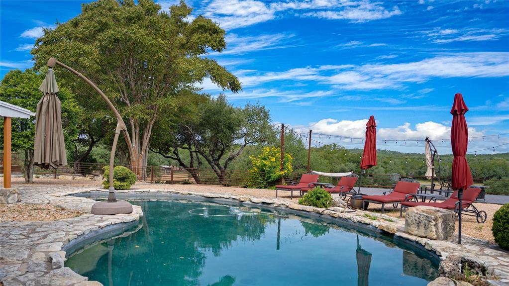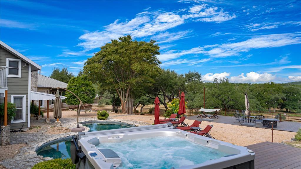 Welcome to Rainbows End Ranch, a premier equestrian estate in the heart of the Texas Hill Country. Situated on 18 fully fenced acres, this exceptional property offers a blend of luxury living and first-class horse amenities. The multi-level main home (3,538 sq ft) features 3 bedrooms, 3.5 baths, with an additional room that can be used as a bedroom or bonus living area. The home features 20,000 gallon reverse osmosis filtration rain water supply, hardwood floors, a stone fireplace, formal dining, and a custom kitchen outfitted with a new SubZero Refrigerator and a new KitchenAid double oven. Washer and dryers convey in main house, casita and in the barn for added convenience. The primary suite is a private retreat with a sitting area and spa jetted and heated bath, creating a peaceful escape after long days on the ranch. Just off the kitchen, step into the large sunroom with wood-burning stove for the cold months, and outside, enjoy the expansive Trex decks, outdoor kitchen, sparkling pool and hot tub overlooking the expansive Hill Country views. A separate one-bedroom, 700 sq ft casita and 528 sq ft barn apartment provide ample space for guests or staff. A 2,500 sq ft steel framed shop and storage building with 4 bays and electric is available for tenants as well. Horse lovers will appreciate the thought and detail that make this a true turn-key equestrian estate: oversized five-stall (10’x15’ stalls) barn with runs attached, rubber paver aisles and wash rack with hot/cold water and tack areas, a regulation 20/60 dressage arena with viewing deck, a covered, lighted 70x70 riding arena for year-round use and seven stallion proof 6ft height 2x4 no climb iron post fencing, all with covered run-in shed shelters. This property is a rare opportunity to lease a complete horse haven in one of Texas’ most sought-after Hill Country towns. Landlord will pay for and maintain groundskeeping, pool & hot tub maintenance. Water and internet included in rent. Agent to verify sq ft.