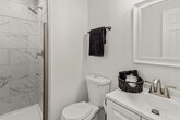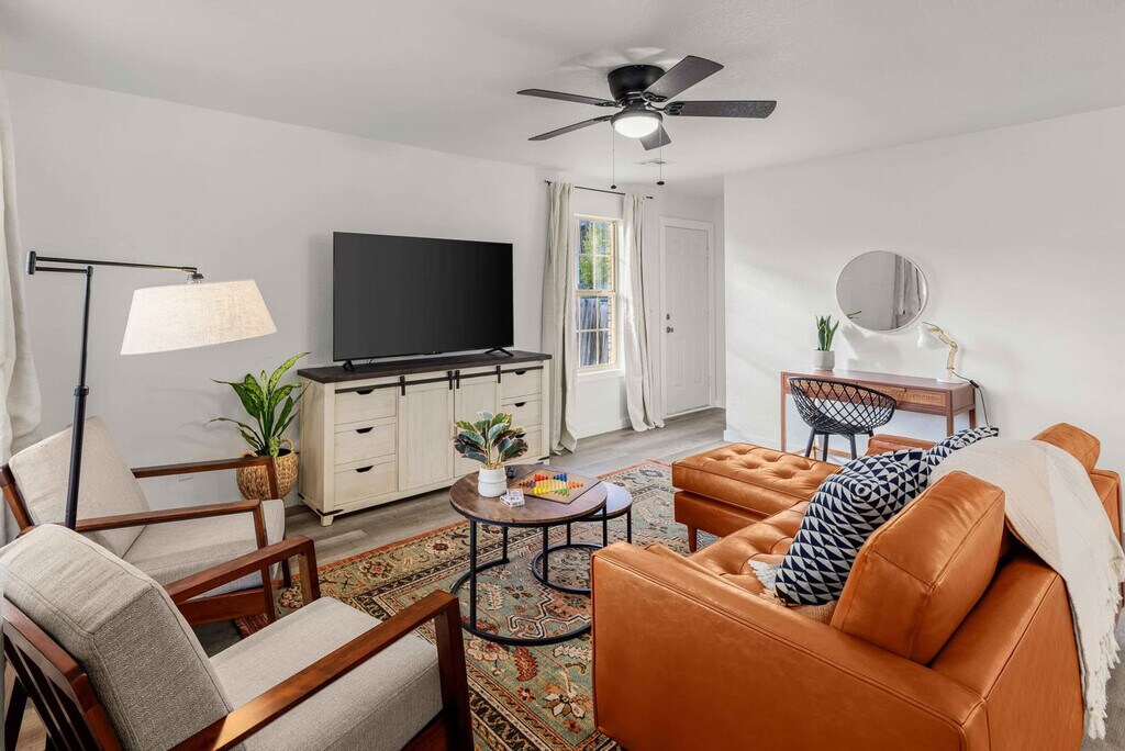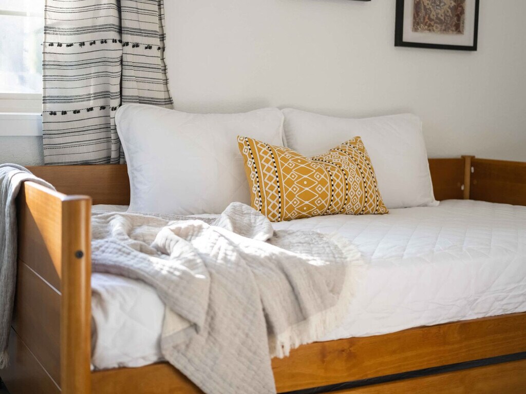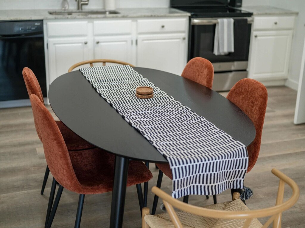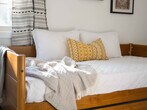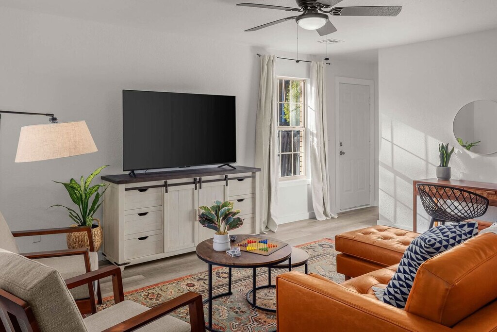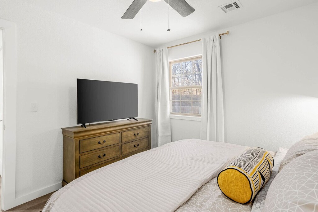 Welcome to your Bentonville home base—a stylish 2-bedroom retreat perfect for riders, families, and professionals. Located just 1.5 miles from downtown and Crystal Bridges, this apartment offers a one-car garage for bikes and gear, and a private fenced yard with a hot tub, patio, and BBQ. Feel at home with a king suite and a queen bed with a trundle, all adorned with plush linens. The open-plan living area invites you to relax, cook, and gather with friends after a day on the trails. Enjoy a bright open layout with comfortable seating, a large Smart TV with streaming included, board games, and a dedicated work nook. The fully equipped kitchen features stainless steel appliances, cookware, spices, and a coffee bar with both Keurig and drip options. The king suite offers a plush bed and ensuite bath, while the second bedroom includes a queen bed and twin trundle, both with quality linens and closet space. The primary bath boasts a walk-in shower and double vanity, and the second bath includes a tub/shower combo. Starter toiletries and towels are provided. The outdoor space features a fenced backyard with a private hot tub, patio seating, and a BBQ grill. Well-behaved dogs are welcome with a fee, and baby gear such as a pack-'n-play and high chair is available with advance notice. Our duplex sits on a quiet residential street close to downtown Bentonville and world-class mountain biking trails. The Slaughter Pen and Coler trails are approximately a 5-minute ride away, and the Crystal Bridges Museum of American Art is just 2 miles from the apartment. The Downtown Square, with its boutiques, cafes, and restaurants, is nearby, and a Walmart Neighborhood Market is only 1 mile away. A car is recommended for getting around, with one-car garage and driveway parking available. Trails start nearby, and ride-share and taxi services are also available. You can walk or bike 15–20 minutes to downtown. Quiet hours are from 9 PM to 8 AM, so please respect the neighbors in the duplex. There is an exterior camera at the front door for safety. Starter supplies such as soap, shampoo, paper goods, and coffee pods are provided, but please restock as needed. The driveway is shared, so do not block the neighbor’s garage or parking area. Communication is available anytime through your booking platform. Includes a dedicated work nook with fast Wi-Fi, making it remote work-friendly. A laptop computer is not included. [SI]