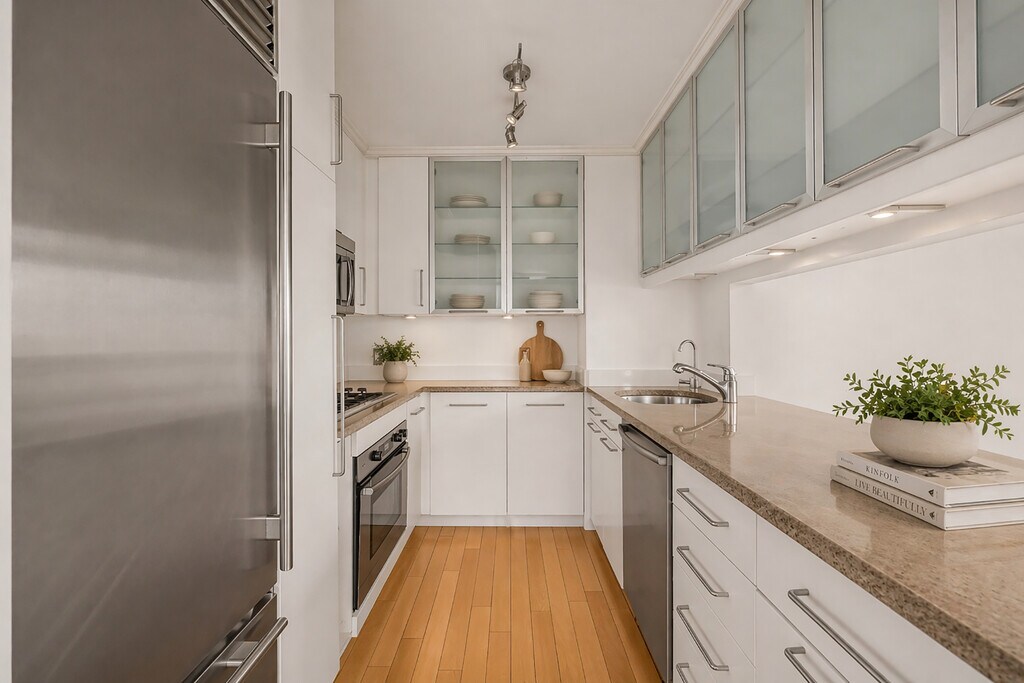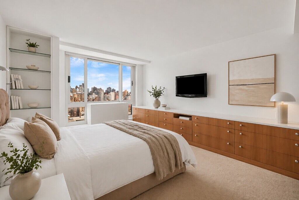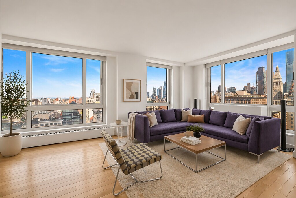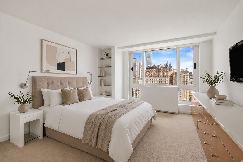 Located in Union Square’s most desirable, amenity-driven condominium, The Zeckendorf Towers. Apartment P24B is a high floor two-bedroom luxury rental with open views to the North and West. The cohesive layout offers a living experience that provides exceptional light, views from every room, and sunsets that can't be beat. The spacious kitchen features a Bosch oven with 5-burner cook top, a Bosch dishwasher, Bosch Microwave, and Sub Zero refrigerator. Stone counter tops and stainless appliances accent the kitchen, which is nicely lit with a welcome pass-through to the dining room The corner Living room holds thoughtful built-in cabinetry that provides extra storage for the apartment. Here you will also find panoramic views to the North and West over Union Square. A HDTV is mounted and hard-wired surround sound speakers are available for use. The second bedroom also features sweeping corner views, and has a custom quality built-in desk with a stone top and detailed mill work. Each bedroom has both blackout and sheer window shades installed. The primary bedroom suite boasts a recently installed walk-in closet and a row of drawers along the eastern wall. A queen size bed is currently in the space, although it is large enough to accommodate a king. A stone-clad bathroom is attached to the primary suite and features custom lighting, a large shower, and extra storage. Other features include HVAC Central Air and wood flooring throughout. Enjoy a luxury lifestyle with condominium amenities including swimming pool, sauna, fitness rooms, yoga studio, common roof deck with spectacular Union Square Park views, on-site garage, valet cleaners and more. The state-of-the-art laundry room is conveniently located on each landing floor. One Irving Place has easy accessibility to all major transportation lines and is near the incomparable Union Square Farmer’s market, Whole Foods, Wegmans, top-tier restaurants boutique shopping in the neighboring Greenwich Village. The building has an award-winning newly renovated lobby, light filled hallways and a landscaped roof garden on the 7th floor, which offers a peaceful transition to home. This premier luxury condominium has a full-time doorman, concierge and live-in super. There is a porte-cochère driveway off of the lobby for easy drop off and deliveries. Convenience that can’t be beat! Available immediately. Condo board application required, inquire today. Condo Management Fees: Application Fee - $750.00 Background Check - $200.00 Move-In fee - $500.00 Move-In Deposit - $1,000.00 (Refundable) Rental Terms: Monthly: $9,500