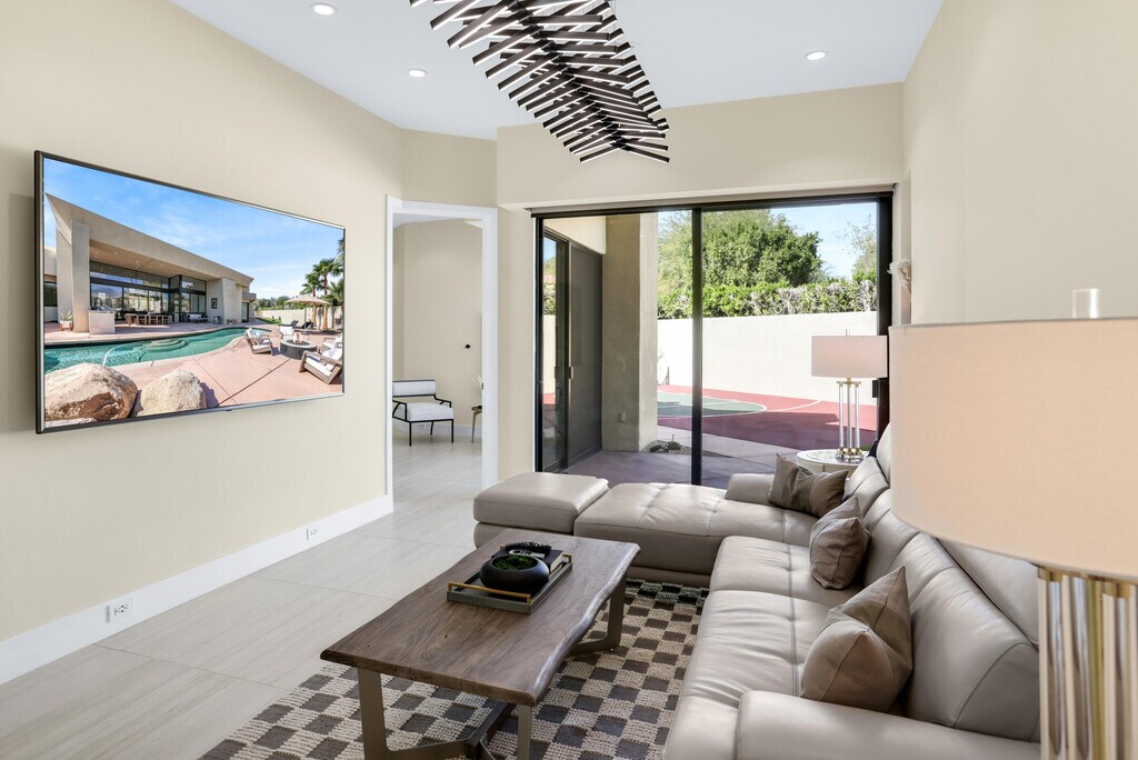 Luxury Contemporary Rancho Mirage Retreat Experience the ultimate in desert luxury at this custom-built estate in the heart of Rancho Mirage: neighbor to the famed Annenberg Estate and Disney's highly anticipated Cotino community. Just minutes from world-class dining and shopping at The River,this private residence is designed for discerning travelers who expect the very best. Indulge in a true resort lifestyle with a free-form pool and spa,outdoor shower,fire pit,and multiple patios seamlessly blending indoor and outdoor living. Walls of panoramic glass flood the home with desert light,framing serene views and creating a dramatic backdrop for relaxation or entertaining. Every detail is thoughtfully curated: Sonos surround sound throughout,electronic blackout shades,one-touch lighting,multi-zoned climate control,sport court,and a choice of premium grills (Gas BBQ and Traeger Smoker). Inside,a full wet bar with ice maker,media room with smart TVs,and a chef's kitchen elevate every gathering. Hundreds of prepaid Prime movies are included for your enjoyment. Four private suites each feature en-suite baths for ultimate comfort. The king primary suite boasts a lounge area and spa-inspired bath. Two queen suites and a private-entry Casita with its own sitting area offer flexibility and privacy for guests. Additional amenities include a two-car garage plus driveway parking,a private laundry room,bi monthly housekeeping and the seamless convenience of a smart home. This is not just a vacation home,it's a sanctuary of modern elegance,designed for travelers who want to experience Rancho Mirage in uncompromising style. Rental Details: Available beginning October 2,2025. $834/night + $50/night utility fee. $595 move-out cleaning fee,$400/mo bi-monthly housekeeping service,$188 admin fee. $5000 refundable security deposit. 30-day minimum stay required. No Pets,No Smoking.