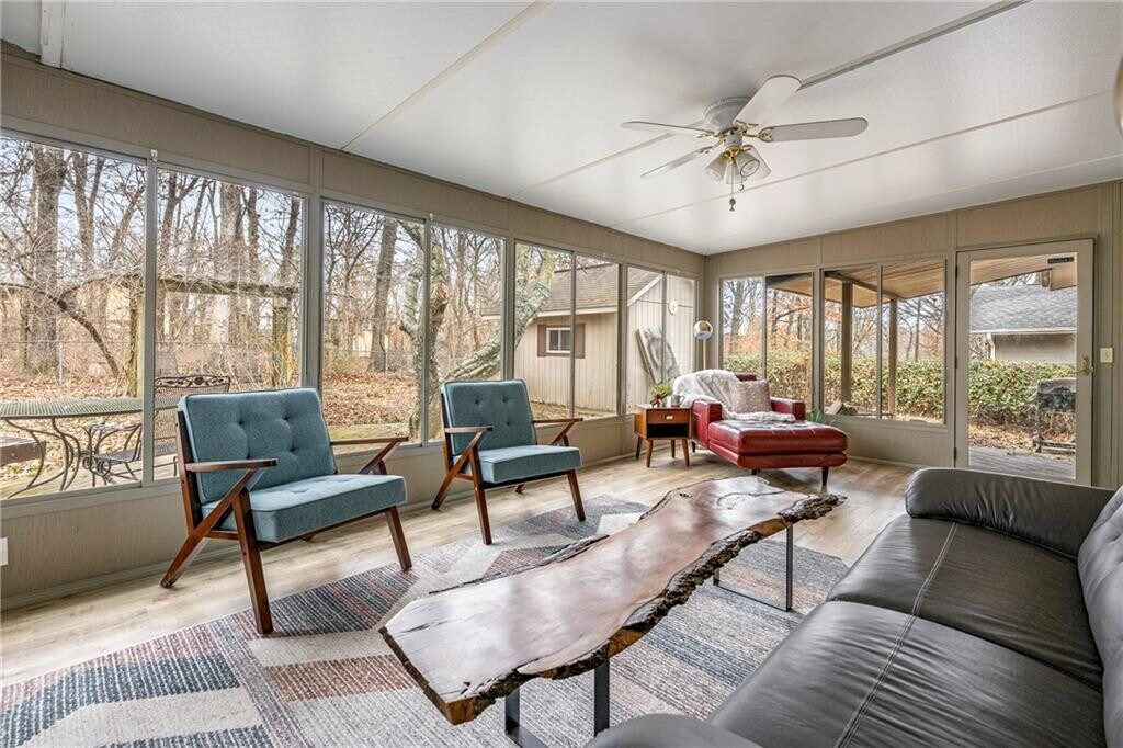 Discover Mid-Century Modern charm in this Bella Vista home! The spacious, open living area features a striking stone wood-burning fireplace. A modern kitchen boasts a large island, sleek fixtures, and quartz countertops. The primary bath is a spa-like retreat with a soaking tub and separate shower. Offering 3 bedrooms, an office, and 2.5 baths, this home also includes a sunroom with peaceful views of the flat, wooded backyard and a heated office with a mini-split for year-round comfort. Enjoy upgrades like high-efficiency HVAC, Anderson windows, Pergo laminate flooring, and a new mini-split. The backyard storage building serves as a versatile workshop. MLS# 1328231