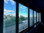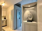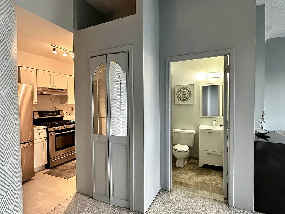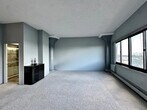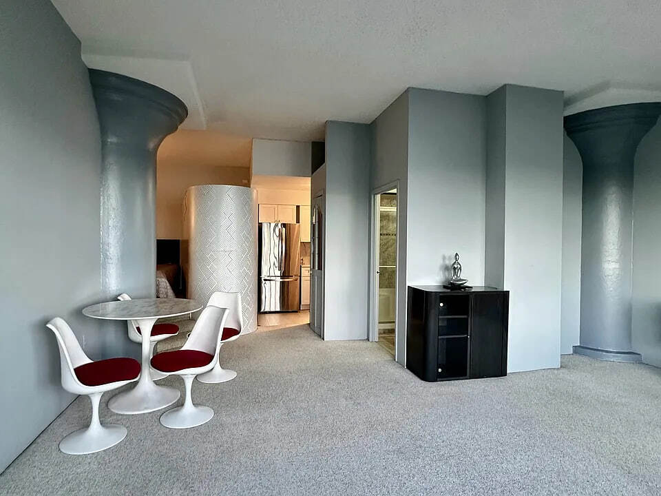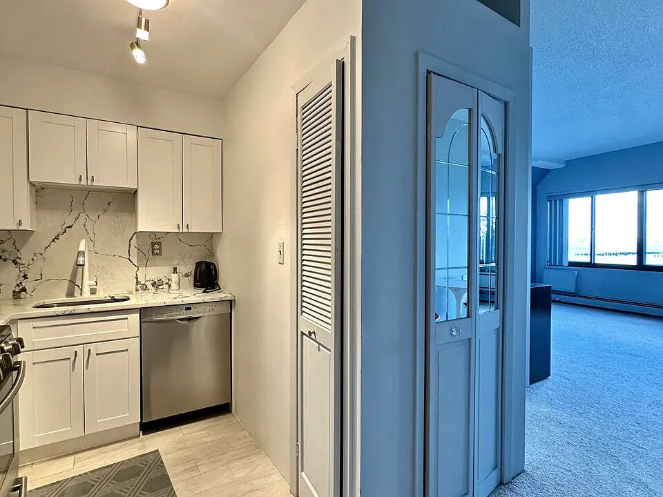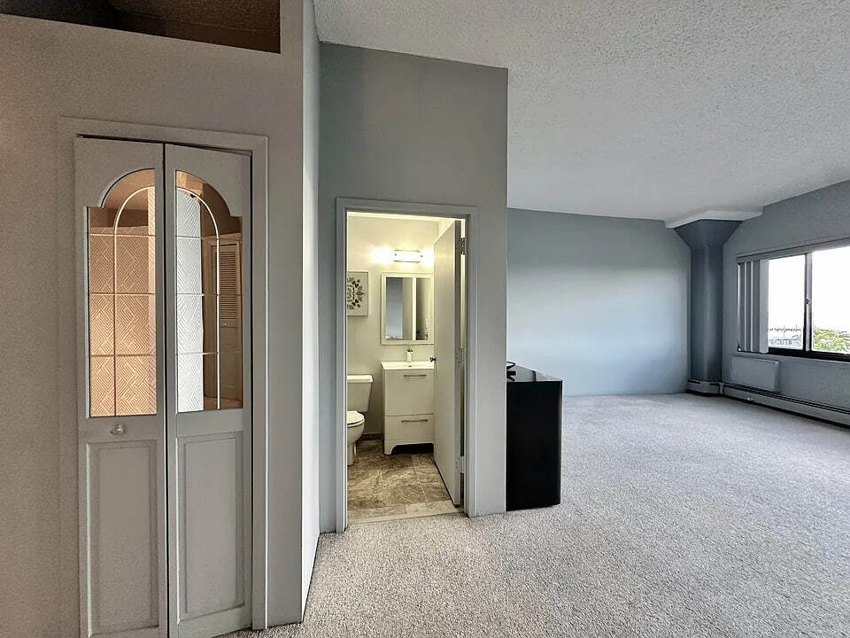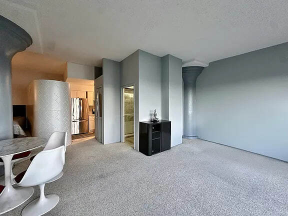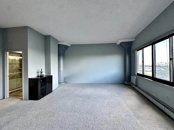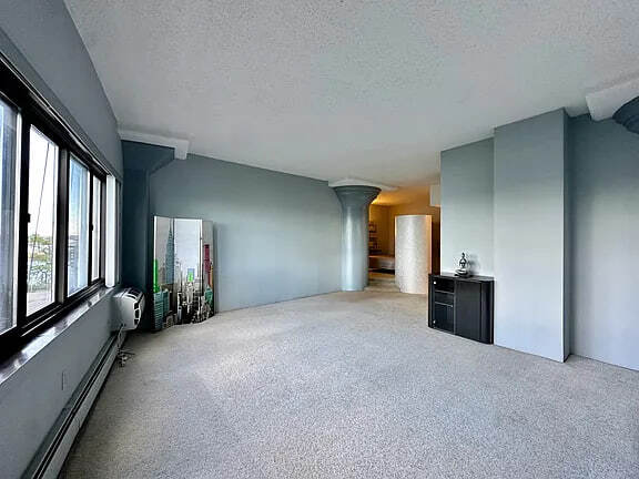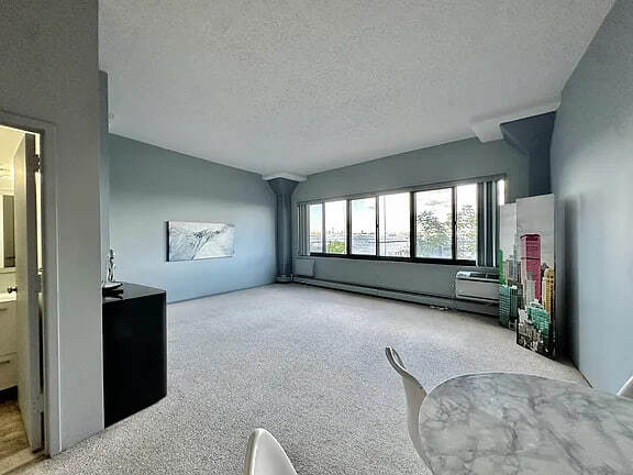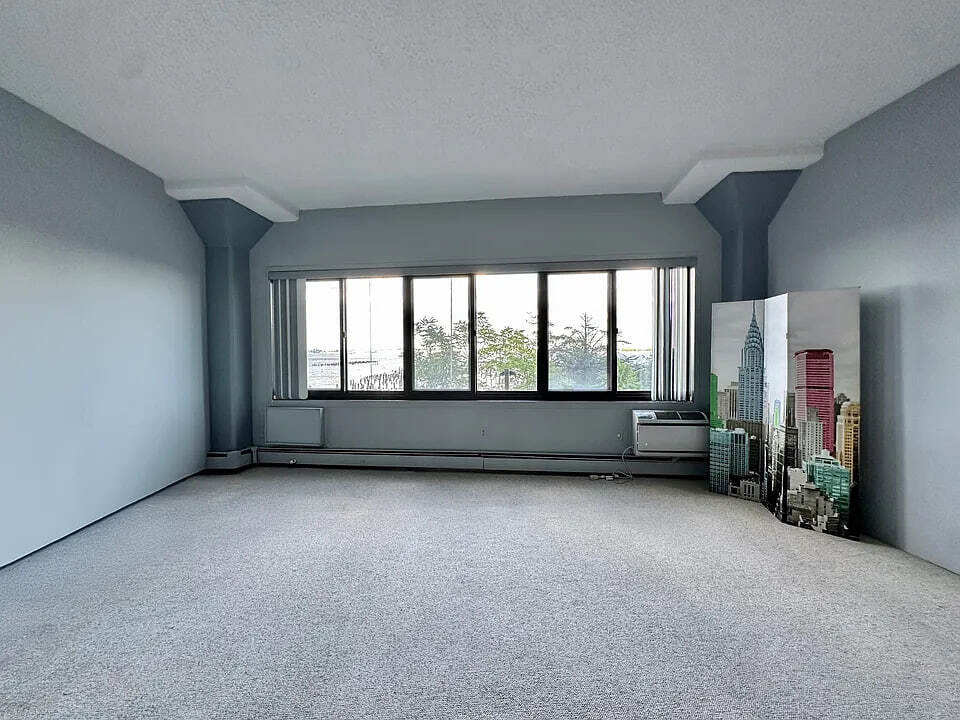 1 Br with panoramic views of the Manhattan skyline spanning to the Verrazano Bridge. Eastern facing, morning light shines into the great living area with high ceilings and structural columns. The carpet is freshly steam cleaned. The kitchen is newly renovated white wood cabinetry with marble counters and SS appliances. It also has a pantry. The bathroom has a storage vanity and walk-in shower. There is a privacy entryway to keep the apartment from being seen during deliveries. The sleeping alcove has views to the windows. You can hear birds and the water while sleeping