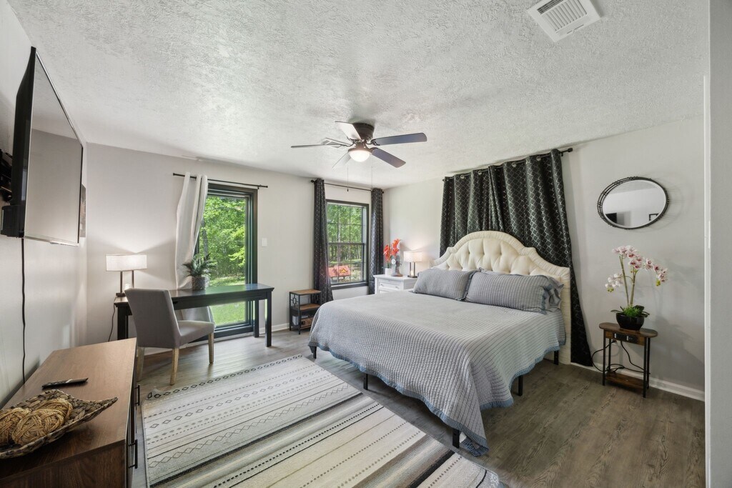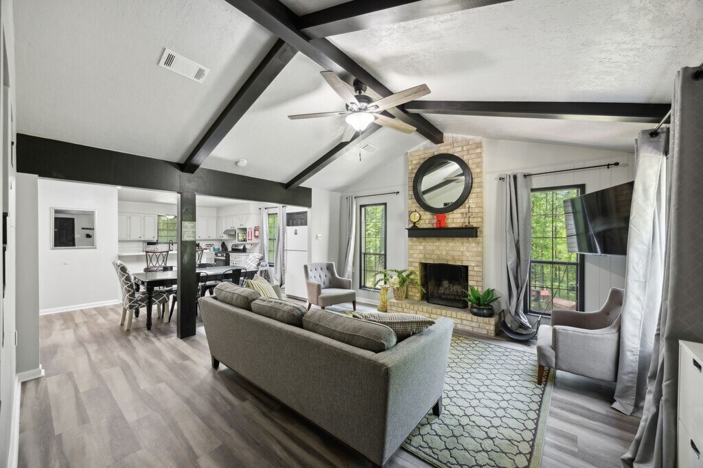 Beautiful home in 11 Acre Property available for lease in Point Blank Tx only minutes away from Lake Livingston and about 75 miles to Houston TX! House is 1872 sq ft offering open concept with high ceilings and a lot of natural light. House has 2 bedroom up,2 bedrooms down,walk in shower upstairs and a tub/shower combo downstairs. Property also has multiple entertainment spaces such as a cover patio,multiple firepit areas,picnic tables throughout property and a pond in the back of property that new tenants will have access to. It is available Fully furnished. Call your realtor today for your private showing ! MLS# 51353862