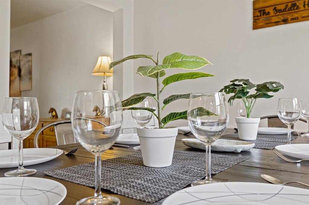 Welcome to The Saddle House, a charming 4-bedroom family retreat with a private pool, just minutes from downtown Saratoga Springs. Styled with elegant equestrian-inspired decor, this dog-friendly haven is perfect for families, horse lovers, and guests coming to enjoy the magic of Saratoga. Whether you're here for the races, a summer escape, or a relaxing family trip, The Saddle House blends comfort, style, and a dash of Saratoga spirit. This delightful home features a swimming pool and outdoor shower, and is within walking or biking distance from Saratoga Springs activities. It sleeps 8 with 4 bedrooms, including 1 king bed, 1 queen bed, and 4 twin beds with 2 trundles. The 1.5 bathrooms include a full bath with a bathtub and shower, and a toilet room. The modern and well-equipped kitchen offers seating for 8 guests, and Wi-Fi Internet with Smart TVs are available throughout the home. The wide backyard is perfect for cornhole and other outdoor activities, and board games are provided for indoor fun. This dog-friendly home allows a maximum of 2 dogs, preferably aged 2 years and above, with a pet fee of $200. All dogs must be crated when left unattended. Free parking for vehicles is available on the premises, with additional street parking. Located just 3.6 miles from Broadway in downtown Saratoga Springs, 4.2 miles from Saratoga Race Course, 5.5 miles from Saratoga Performing Arts Center, 6.7 miles from Saratoga Lake, 11 miles from Brown's Beach, 25 miles from Lake George, and 50 miles from Gore Mountain Ski Area, this home offers easy access to all the attractions Saratoga has to offer. The pool is closed from October to May and is not heated. The minimum booking age is 25. The home is fitted with a smart door lock. Guests are required to sign the property rental agreement, which includes the house rules. By booking, you accept responsibility for any damage or extra cleaning your dog causes during the stay. No dogs left home alone unless crated, and please clean up after your pet. Guests have access to a workspace, making it convenient for those who need to work from home during their stay. [SI]