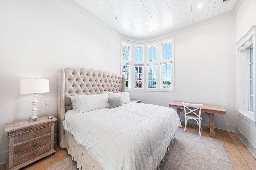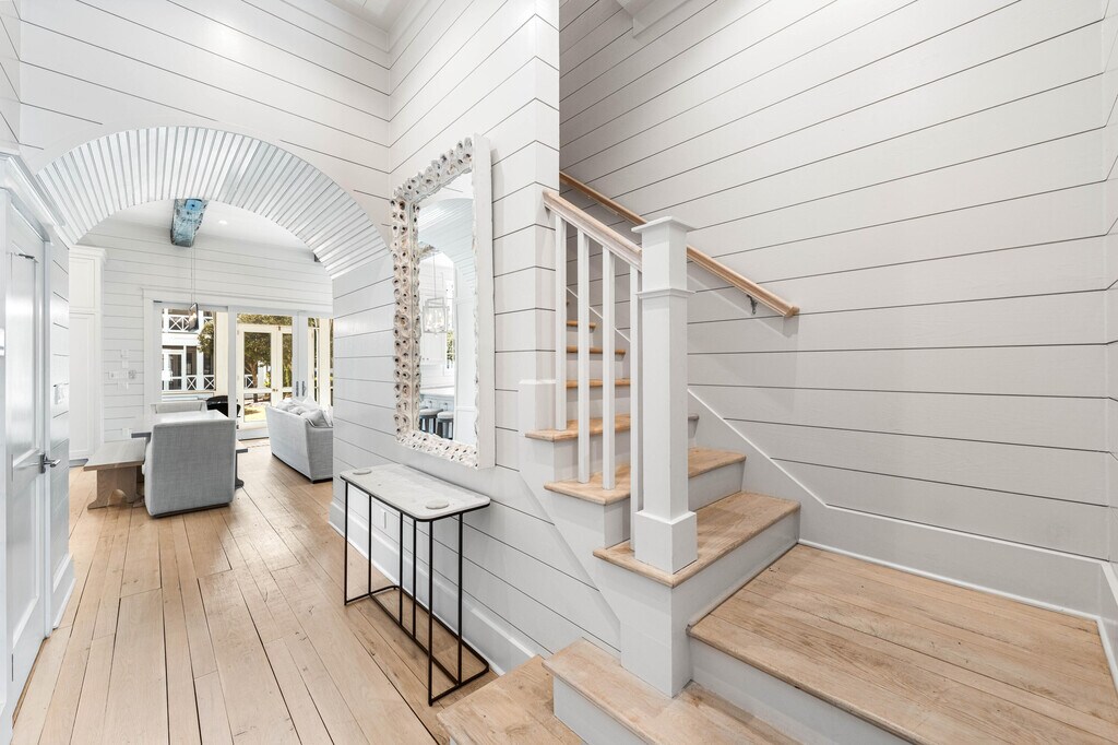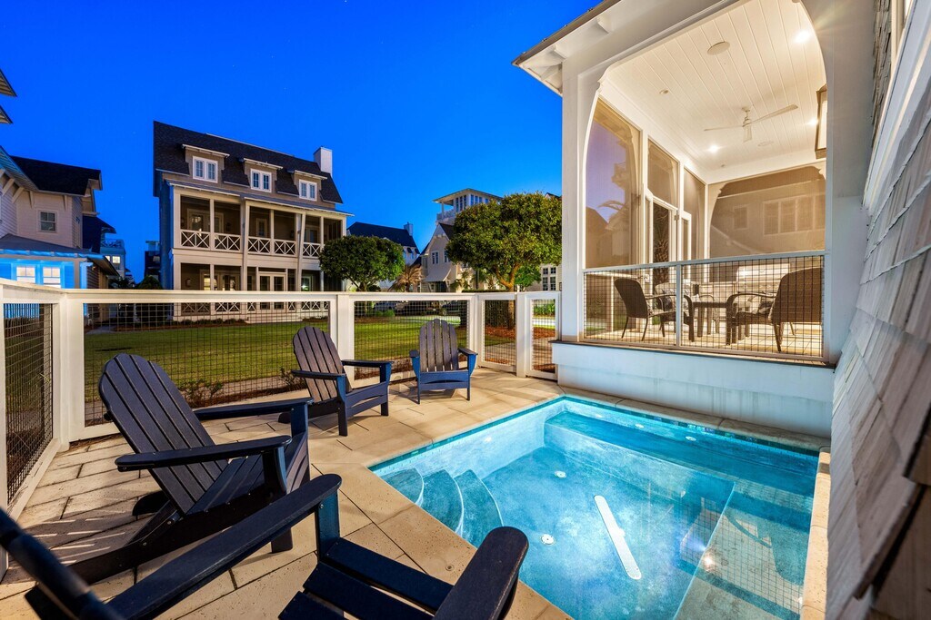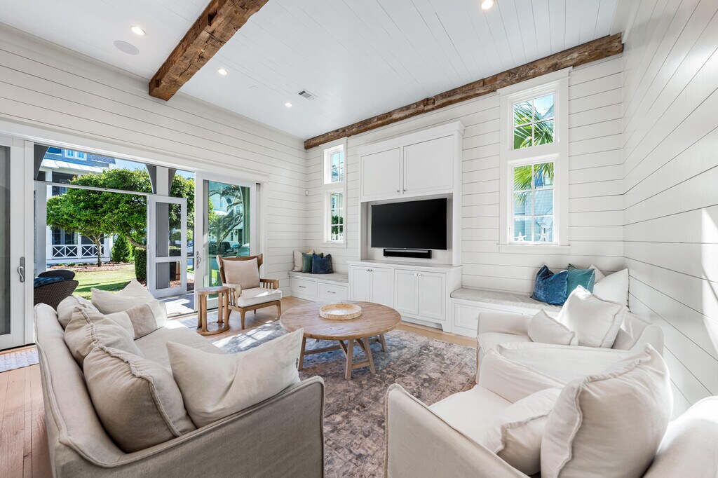 Welcome to 10 Rainer, an exceptional residence offering refined elegance, elevated design, and effortless access to the optional WaterSound Beach Club--just 600 feet away. Tucked behind the private gates of Grace Point and backing onto serene community green space, this home combines timeless coastal Nantucket architecture with sophisticated modern finishes. Upon entry, you're greeted by soaring 12-foot ceilings, shiplap walls, and rich hardwood flooring that flow seamlessly throughout. The main living space exudes warmth and comfort while offering ample room for entertaining. The gourmet kitchen is appointed with marble countertops, custom cabinetry, and high-end appliances--perfectly complemented by a summer kitchen on your screened-in porch with beverage cooler and ice maker
