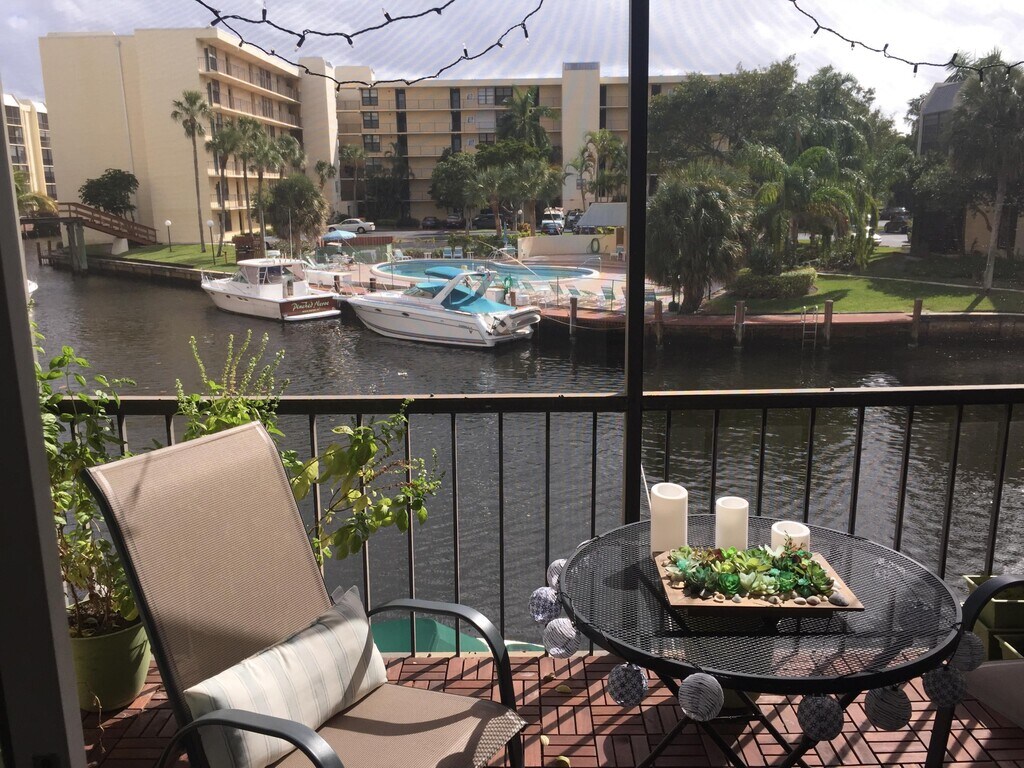 Modern waterfront condo with gorgeous master bedroom,living room & balcony views of intracoastal canal waters,docked boats and community pool! Sleek earthy Porcelain floors throughout. Must see to appreciate this heavenly space. Eastern view from covered screened-in balcony. Enjoy the amenities Boca Bayou community has to offer including multiple pools,spa's,exercise room,clubhouse,boat docks,tennis courts,on-site management,security patrol,manned guard gate and much more! Unit also comes with extra storage cage on your floor. Available unfurnished. MLS ID B26019786