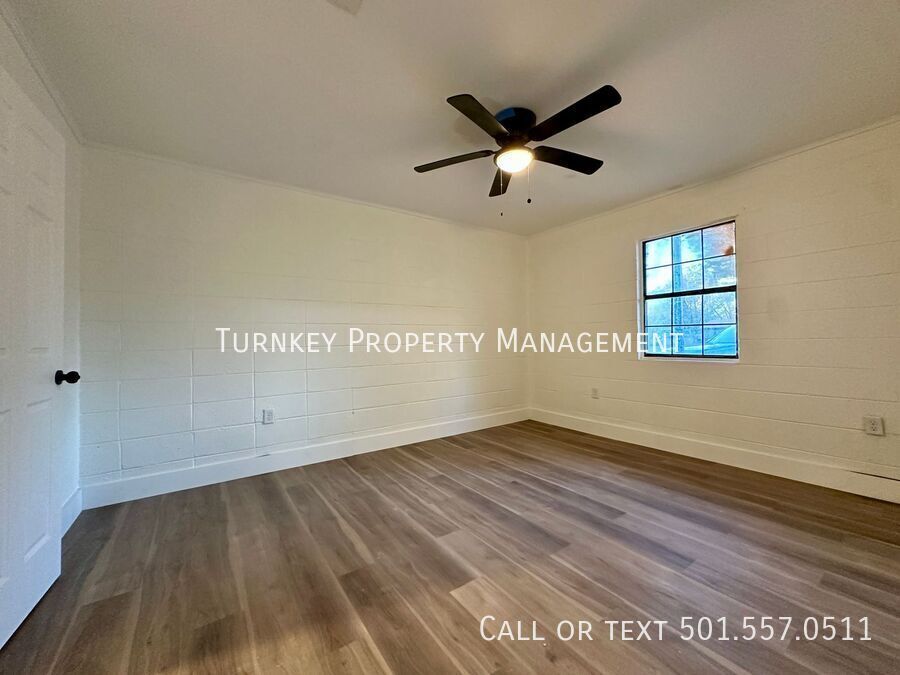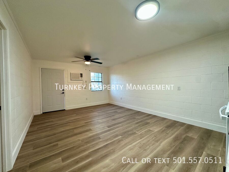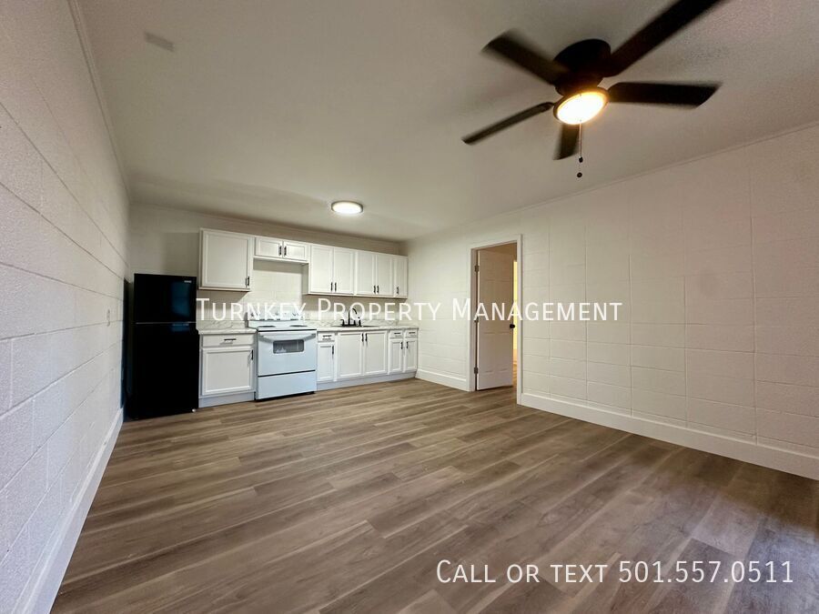 This apartment makes the most of its space with a thoughtful layout. The open living area blends the kitchen and living room, featuring wood-look flooring and white brick-style walls. The modern kitchen includes white cabinetry, a full-size refrigerator, and a range. The bedroom offers a bright, comfortable space with a large window. The bathroom has a clean, white design with a shower and tub combination. Ceiling fans and recessed lighting throughout add comfort and a warm feel. Overall, the apartment’s efficient design creates a cozy and functional place to live Fridge Included Pets Allowed Washer / Dryer On Site Water