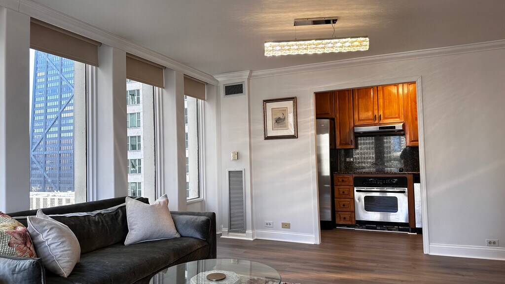 FULLY FURNISHED. One of the largest 1BR corner units with North and East views of stunning Chicago architecture! Floor-to-ceiling windows across living room and bedroom. Updated unit with hardwood floors. Rare IN-UNIT laundry. Kitchen has granite countertops and backsplash. Bathroom has beautiful marble tiles from floor to ceiling. Building is *pet friendly* - cats and dogs allowed up to 75 lbs (very rare for high rises in this area). Amenities include 24-hour doorman,gym,rooftop pool & deck,party room,and laundry facility with panoramic views of the city. PRIME location on Walton St,right off Mag Mile/Michigan Ave and surrounded by luxury shopping,amazing restaurants,Water Tower Place,John Hancock Center,and more! Easy transit access. Rent includes basic cable,high-speed internet,heat,air conditioning,water,and 24-hour door staff. Tenant only pays for electricity. MLS# MRD12485925 Based on information submitted to the MLS GRID as of [see last changed date above]. All data is obtained from various sources and may not have been verified by broker or MLS GRID. Supplied Open House Information is subject to change without notice. All information should be independently reviewed and verified for accuracy. Properties may or may not be listed by the office/agent presenting the information. Some IDX listings have been excluded from this website. Prices displayed on all Sold listings are the Last Known Listing Price and may not be the actual selling price.