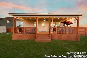 Stunning single-story home featuring 3 bedrooms, 2 bathrooms, and a breathtaking backyard with a covered deck. Step inside to discover high ceilings, an open concept layout, and luxury tile flooring throughout the main living areas. The kitchen is a dream, boasting granite countertops, an oversized breakfast bar, and an included refrigerator. Seamlessly connected to the dining and living rooms, the kitchen offers an ideal space for entertaining. The bedrooms are adorned with plush carpeting, with the primary suite serving as a true retreat. It includes an enlarged walk-in shower, double vanity, and a spacious walk-in closet. Outside, the property sits on over a quarter acre, providing ample space and privacy. The backyard is a gem, complete with a covered deck and storage shed, making it a perfect gathering spot. The HOA amenities add the additional benefit of access to the community pool and playground.