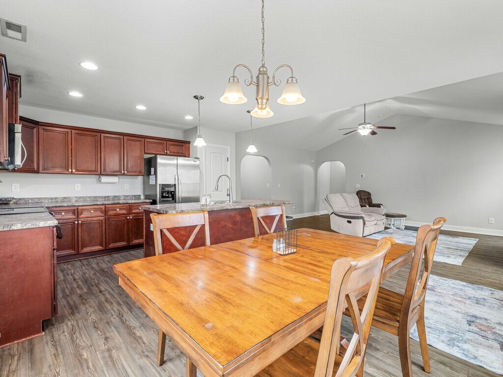 Welcome to this inviting 3-bedroom, 2-bath residence featuring a finished bonus room over the garage offering plenty of space and flexibility for modern living. With over 1,800 square feet, this home blends comfort, thoughtful updates, and generous indoor and outdoor living. The bright, open floor plan connects the living, dining, and kitchen areas, creating a seamless space ideal for everyday living and entertaining. The main living area showcases vaulted ceilings and durable waterproof LVP flooring, while the cozy fireplace adds warmth and charm. The kitchen provides ample counter space, a pantry, stainless steel appliances while the dining area overlooks the expansive backyard. The primary suite serves as a private retreat, complete with a tray ceiling, walk-in closet, and en-suite bathroom. Two additional bedrooms and a full guest bath are conveniently located on the main level. Upstairs, the finished bonus room with a closet offers versatile space - perfect for a home office, playroom, or guest area. Step outside to enjoy the recently updated deck, ideal for relaxing or entertaining. Situated on a 0.69-acre corner lot, this home offers plenty of room to spread out, garden, or enjoy outdoor activities. Additional highlights include an attached two-car garage with high ceilings, providing excellent overhead storage. This home offers the space, layout, and features renters are looking for - schedule your showing today!
