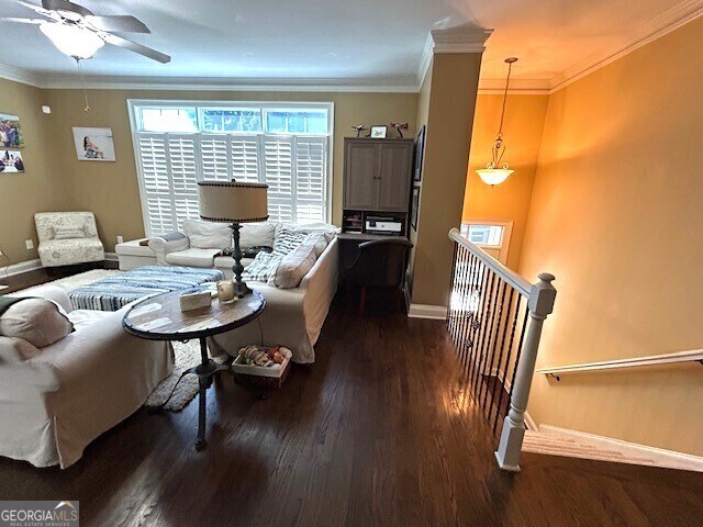 Beautiful Luxury Town Home in PTC for that extra low maintenance lifestyle that you've been looking for. Just lock & go! Adjacent to Golf Cart Paths. 4 bdrms /4.5 baths. Master on the Main! 2 huge bdrms up & 1 at terrace level (also a great office space) - all bedrooms have private bathrooms. Upgrades - Hardwoods, Craftsman Trim & Crown Molding, Granite Kitchen Counter Tops w/ Tile Back Splash, and Top of the line Stainless Appliances. All baths have tile shower surround & tile flooring. Large master bedroom w/ trayed- vaulted ceiling, extra-large shower, jetted tub & dual vanities. Private back deck & downstairs covered patio with parking area for your golf cart. Rent includes Yard Maintenance, Water & sewer, Garbage Pickup, & Fridge. Convenient to: Shopping, Dining, Studios, Hospital, Airport & ATL, Award-Winning PTC Schools! And the new FIFA Soccer Complex. Occupied - Call Agent for Appointment - at least 4 hours ahead please.