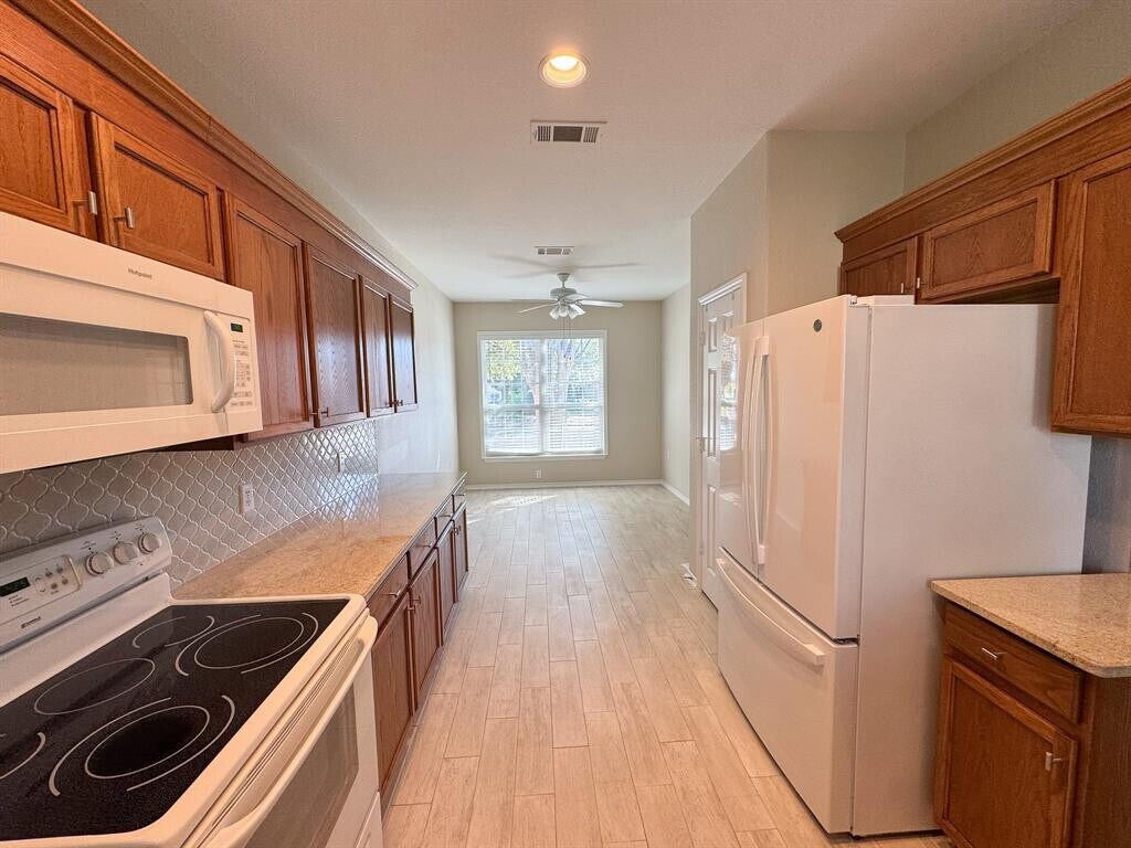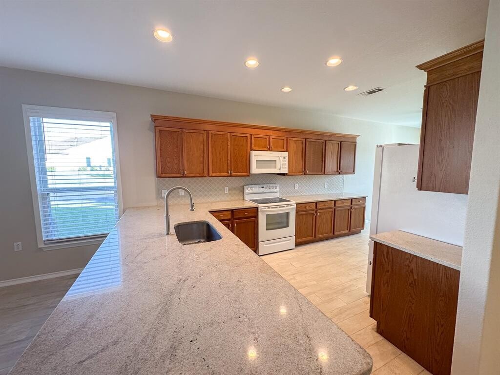 Welcome to 100 Sunbird Ct in Sun City Georgetown! This well-maintained 3 bedroom, 2 bathroom home sits on a quiet cul-de-sac and backs to a peaceful greenbelt, offering both privacy and comfort. The kitchen features granite countertops throughout, a new LG dishwasher, and a French door refrigerator installed in 2023, with ample cabinetry and built-in pull-out drawers for convenience. The spacious primary suite includes double-hung walls in the walk-in closet for maximum storage, and both bathrooms showcase upgraded granite counters. Step outside to enjoy the iron-fenced back patio overlooking the greenbelt, perfect for relaxing or safely letting small pets play — a rare find in Sun City! The yard is maintained by the Sun City LMH Association, so tenants can enjoy a low-maintenance lifestyle. Additional highlights include a utility sink in the 2-car garage, full exterior repaint, new air conditioner (spring 2025), new hot water tank and water softener (spring 2025). This home combines upgrades, thoughtful details, and the unbeatable Sun City lifestyle with golf, pools, fitness centers, walking trails, and countless clubs and activities — all just minutes from shopping, dining, and healthcare in Georgetown.