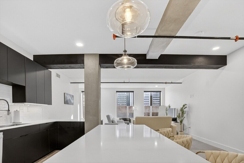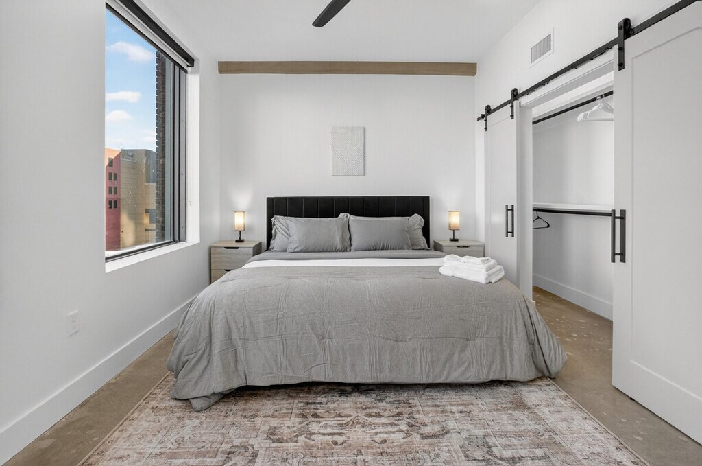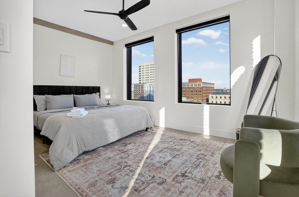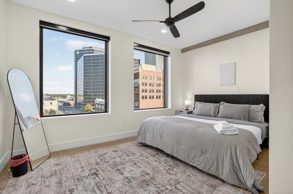Feel at home in this modern 2-bedroom industrial loft in the historic Beacon Building, just one block from the BOK Centre. This apartment offers skyline views and 12-foot ceilings. The loft features 12-foot ceilings, large windows, and exposed steel accents, creating an airy, industrial-modern vibe. The open and bright living area includes a Smart TV and fast Wi-Fi. The kitchen is fully equipped for cooking. You'll also have central A/C and heat, and every amenity for a comfortable, extended stay. Historic building features, such as the concrete floors, have been preserved. Paid parking is available for $10 per night on weekdays and $15 per night on weekends. Beginning January 1st, guests can access the brand-new fitness center, dry sauna, and resident lounge. A combo washer/dryer is available for use in the apartment. Centrally located in Downtown Tulsa’s Entertainment District, this apartment is steps from the BOK Center and minutes from everything downtown. Cain’s Ballroom is about 13 minutes walking or 3–4 minutes driving, and the Cox Convention Center is 3 blocks away. The Tulsa Performing Arts Center is an 8-minute walk, and the Tulsa Club Hotel (Chamber Restaurant) is 3 blocks away. Nearby dining favorites include The Vault, Juniper, Elgin Park Brewery, Fassler Hall, and Antoinette Baking Co. Cultural highlights close by include Philbrook Downtown, Woody Guthrie Center, and Greenwood Rising Museum. Guthrie Green, with live events and markets, is a 10-minute walk, and The Gathering Place, an award-winning riverside park, is a 10-minute drive. You’re surrounded by art, culture, and great food. No events or parties are allowed, per city ordinance. Items left behind will be held for up to 14 days. If you'd like an item returned, a $35 lost and found management fee will apply, which covers the time and handling involved in locating, storing, and preparing the item for shipment. Guests are required to provide a prepaid shipping label for the return. A $150 penalty will be imposed if the camera is disconnected, tampered with, or relocated from its original position. [SI]