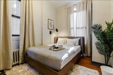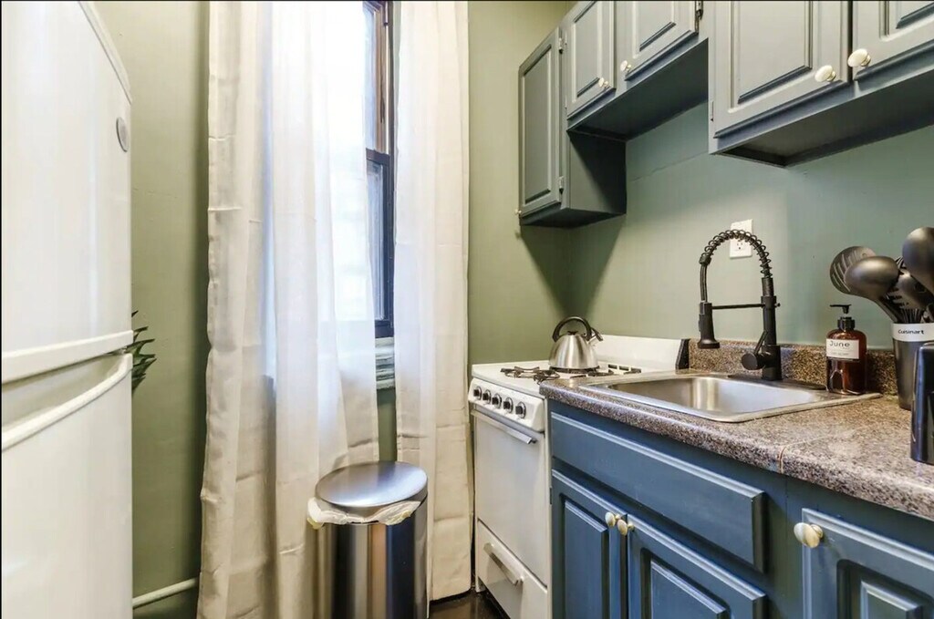 Feel at home in this charming Upper West Side 1-bedroom, 1-bathroom furnished apartment. This centrally located home is on the third floor (3 flights up). This chic 1-bedroom, 1-bathroom home is the perfect place to relax and unwind, featuring the best amenities and decor. This home has deep green and blue tones balanced by natural wood furniture and hardwood floors. The living room features a blue sofa, gold accents such as the coffee and breakfast table, as well as a TV for all your home entertainment needs. The kitchen boasts blue wooden cabinets and stainless steel appliances, while the bathroom features a newly tiled facade. The master bedroom has ample closet space, a plush rug, and full length curtains for privacy. There is an extra $25/night for the 4th person, and air mattresses can be provided. Paid parking is available. A seven-minute walk from the front door of the building will get you to the train station and Central Park West for the A, B, and C trains. This apartment is a smoke-free unit.