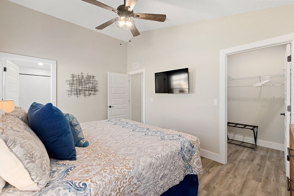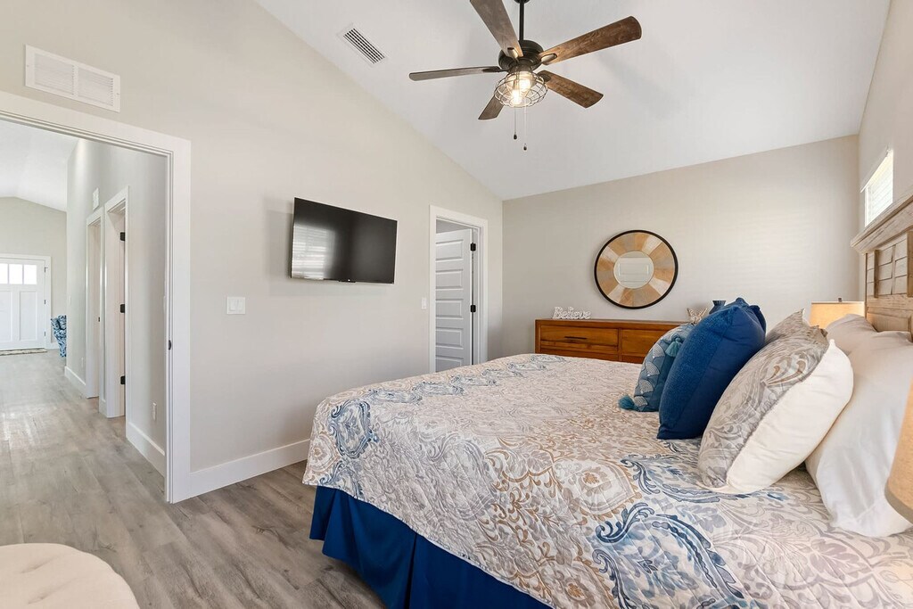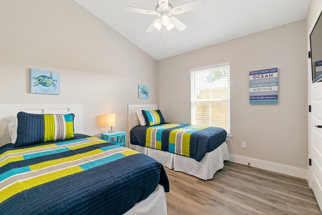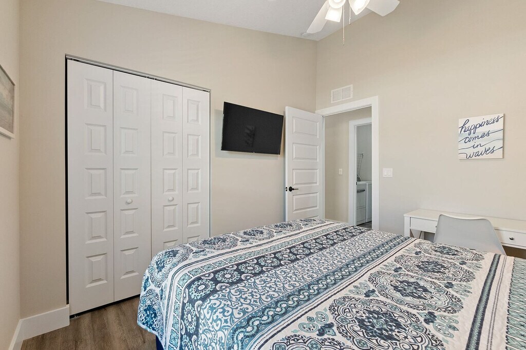 Feel at home in this charming 3-bedroom, 2-bathroom cottage, perfectly situated in a central location just 3 miles from Downtown St. Augustine and 5 miles from the nearest beach. The cottage features a king-size master bedroom with an ensuite bathroom, a queen guest bedroom with a desk, a twin guest bedroom, and a queen sleeper sofa in the living room. Enjoy the convenience of smart TVs in all bedrooms and the living room, free internet, a fully equipped kitchen, an outdoor electric grill, and parking for two vehicles. Step onto the sunny front patio and check yourself in to be greeted by bright, sun-filled rooms designed with your comfort in mind. The open-concept living area invites you to relax on a plush chaise lounge while enjoying a 55” smart TV. The modern kitchen is fully equipped with stainless steel appliances, cookware, dinnerware, and utensils, along with a coffee machine and grinder. Dine at the stylish table set for six or at the breakfast bar with additional seating for four. Each bedroom offers comfortable beds with quality linens, smart TVs, closets, ceiling fans, and USB charging stations. The master bedroom boasts a king bed, ensuite bathroom, and walk-in closet, while the other two bedrooms share a central bathroom stocked with essentials and fluffy towels. Enjoy the convenience of an in-unit washer and dryer, as well as an iron and ironing board. On sunny days, cook on the side deck's electric grill or relax on the front patio with Adirondack chairs and end tables. Parking is available for two vehicles. Nestled in a quiet, leafy neighborhood, this cottage is just minutes from the Historic District, where you can explore restaurants, bars, boutique shopping, and attractions. The Royal St. Augustine Country Club is a short 4-minute drive away, and the Publix supermarket is only 5 minutes from the house. Discover the charm of St. George Street, lined with boutiques, restaurants, and historic homes, or wander to Aviles Street for art galleries and gourmet treats. Visit the Lightner Museum and Flagler College, or take a ghost tour of the city. The Old Town Trolley Tours offer a fun way to see the city with hop-on, hop-off service. The home has an active security camera installed at the front door. Quiet hours are enforced between 10pm and 8am. The minimum age to book is 25, and the primary guest must be present for the duration of the stay. No parties or pets are allowed, and smoking or vaping is strictly prohibited on the property. Late check-outs and early check-ins are subject to additional fees. Guests are liable for any property damage during their stay. The home is not child-proofed, so parents with young children should use the home at their own risk. Checkout procedures must be followed, and any excessive mess may result in additional cleaning fees. The queen guest bedroom includes a dedicated workspace with a desk, making it ideal for remote work.