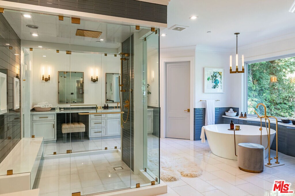 This is an incredible opportunity to own a private and secure Brentwood estate tucked within the prestigious Grove Estates enclave. This expansive 14,000-square-foot residence sits behind gates and offers sweeping canyon vistas and striking views of the Getty Center. A dramatic entrance welcomes you with soaring ceilings, a statement skylight, and a dazzling chandelier centerpiece. The kitchen is a truly exceptional space for hosting and gathering, featuring a distinctive U-shaped island and double sets of top-tier Viking and Sub-Zero appliancesdesigned with the entertainer in mind. Set on a just-over-half-acre lot, the outdoor space is a private retreat complete with resort-style pool and spa, built-in BBQ, open-air kitchen, outdoor media lounge, and a grassy yard framed by majestic mature Oak trees. The main floor includes an elegant formal dining room, a family lounge featuring handmade artful wall coverings by de Gournay, kitchen, and mini-suite guest accommodations all thoughtfully laid out to enhance everyday living and entertaining. The lower level is an entertainer's dream. It currently features a well-sized indoor basketball courtoriginally built as a lap pool and easily converted back at the new owner's discretion. This level also includes a spacious gym, dry sauna, fully equipped bar, 500-bottle wine cellar, private movie theater, putting green for golf enthusiasts, and collector's garage with capacity for 10 vehicles. Upstairs, the primary suite is a luxurious escape featuring a double-sided fireplace, spa-like bath with soaking tub, large dual closets, a large walk-in shower with steam, and a private oversized balcony with backyard views. Four additional generously sized en-suite bedrooms with high ceilings and a versatile playroom or office with a private balcony center around the upper landing. A separate mid-level suite is ideal for staff, guests. Experience the height of refined Los Angeles living in this one-of-a-kind estate. MLS# 25559753