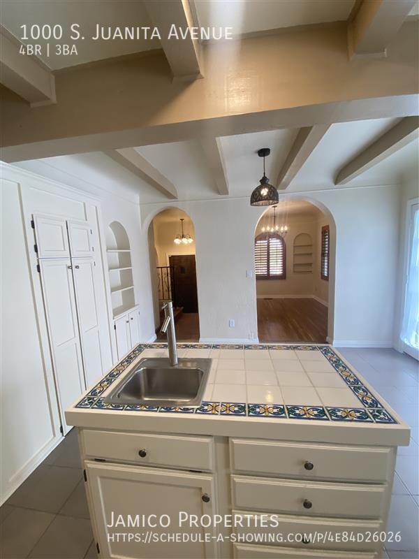 DO NOT DISTURB TENANTS! Distinctive Spanish-style home with a solid hardwood entry door that welcomes you into a truly enchanting setting. The expansive living room (approximately 16’ x 21’) features soaring 13-foot cathedral ceilings with handcrafted wood beams, a custom fireplace, graceful arches, and architectural niches that add warmth and charm. Original inlaid hardwood floors and classic shutters are found throughout the home. The kitchen is equipped with a JennAir range, dishwasher, fridge, and a center island with a prep sink, along with a cozy breakfast nook just off the kitchen. A spacious formal dining room with direct access to the backyard provides an elegant setting for gatherings. The main level includes a versatile library/study/office or bedroom located next to a full bathroom. Upstairs, the oversized primary suite offers vaulted ceilings, skylights, ocean views, and an en-suite bathroom. The third bedroom features an ocean-view balcony—perfect for enjoying sunsets—while the fourth bedroom is extra large and includes an attached bonus room. The private rear yard is beautifully finished with brick paving, mature landscaping, and an outdoor kitchen complete with quartz countertops, a sink and BBQ grill—ideal for entertaining. Additional features include copper gutters and a three-car garage with alley access. *Sorry, no pets allowed.* Shown by appointment only. Application Fee: $50 per adult 18+ Resident Benefits $10 per month included in rent price Check out our resident benefits package here: /resident-benefits-2 Renter's Insurance is required for all properties, we offer an option for those interested at $13 per month. 11 months Ceramic Floor Forced Air Heating Garage Detached Hardwood Large Bedrooms Quartz Range Range Oven Recently Remodeled Shower Doors Tile Vinyl Planks W/D Hook Ups