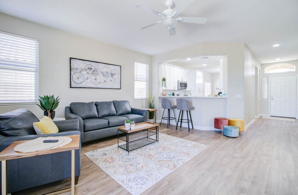 FURNISHED RENTAL - No Min Rental Term! Enjoy this incredible home in the heart of Gilbert, situated in Greenfield Lakes, overlooking the lush Golf Course. This 3 bedroom, 2 bathroom FULLY FURNISHED & REMODELED home features a 2 car garage, upgraded quartz countertops, white shaker cabinetry, luxury vinyl plank flooring in all the right locations, and a backyard oasis with a sparkling pebbletec play pool overlooking the Greenfield Lakes golf course and offering spectacular sunset views. Your bright and airy kitchen features stainless steel appliances, quartz countertops and white soft close cabinets. The beautifully open great room features tall ceilings, sliding glass doors to the outdoor area, lounging space and multiple closets for storage and organization. The master suite features a Queen size bed and copious amounts of natural lighting and storage space featuring the renovated en-suite which features dual sinks along with floor to ceiling tile work and soft close white cabinets. The first guest bedroom features a queen sized bed, and the second guest bedroom features two twin sized beds. The backyard features desert landscaping overlooking the 12th hole of Greenfield Lakes Golf Course. Along with the private resort-like pool, you have a pavered covered patio that has a seperate gate to the pool for safety and lounge chairs for enjoying your Arizona nights! Situated nearby shopping, restaurants and of course golfing galore! Seasonal Rates Apply: Jan - April $6,500.00/ Month w/ utilities/cable/internet included. May - Sept $3,500.00/ Month w/ utilities/cable/internet included. Oct - Dec $5,000.00/ Month w/ utilities/cable/internet included. **Utilities/cable/internet only included on leases 3 months or less. $150 Utility Cap Applies To schedule a viewing or apply please visit: $350.00 Cleaning Fee $250.00 Pet Fee (each pet, if applicable) $150.00 One Time Admin Fee $10.00 Monthly Admin Fee By submitting your information on this page you consent to being contacted by the Property Manager and RentEngine via SMS, phone, or email.
