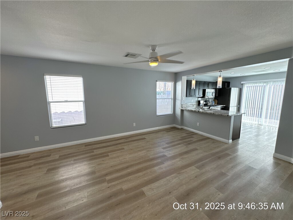 SILVERADO RANCH SINGLE STORY! This upgraded 3-bedroom, 2-bath home offers an open and inviting layout with stylish vinyl wood plank flooring throughout—no carpet! The spacious kitchen features granite counters, custom cabinets, a breakfast bar, and stainless-steel appliances, perfect for everyday living. The primary bedroom provides comfort and functionality with a tub/shower combo. Enjoy a low-maintenance backyard with a patio and synthetic grass, ideal for relaxing or entertaining. Conveniently located near shopping, dining, and easy freeway access. Small dog considered—no cats.