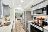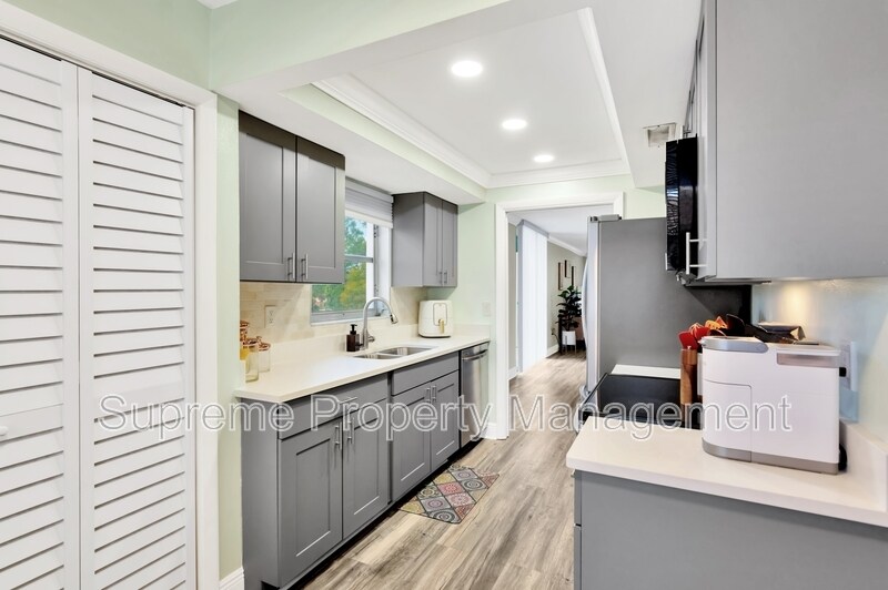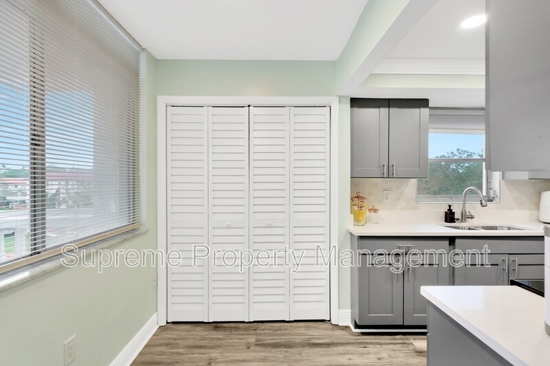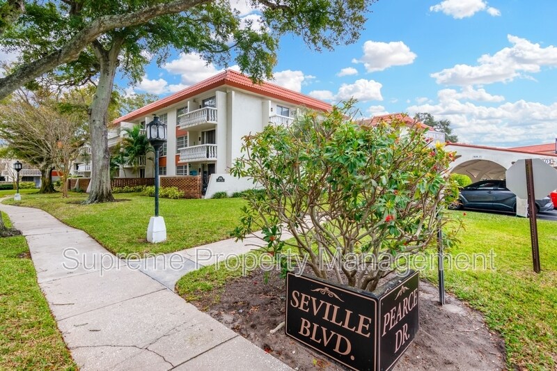 Beautifully renovated 2-bedroom, 2-bath corner unit on the 3rd floor of Building II in Seville Condominiums, a desirable 55+ community with elevator access. This spacious 1,200 sq ft home features water-resistant laminate flooring throughout, crown molding, and an updated kitchen with soft-close cabinets, quartz countertops, stainless steel appliances, pantry, and eat-in dining area. Both bathrooms are upgraded, and the primary suite includes a walk-in shower and two spacious closets. Recent upgrades include a newer electrical panel and HVAC (Dec 2022). Enjoy abundant natural light and two private balconies off the dining and living areas. The home is semi-furnished with a couch, coffee table, and TV stand. Community amenities include a heated pool, fitness room, billiards, party and card rooms, full kitchen, shared laundry, lush landscaping, and ample guest parking. Conveniently located within walking distance to Clearwater Mall and less than 30 minutes from Tampa, St. Pete, beaches, shopping, dining, and major airports. Currently occupied. Available approximately two weeks after lease and HOA approval. Rent includes: Cable & Internet, Water, Sewer, Trash, and two assigned covered parking spaces. Tenant is responsible for electric utilities. Renter's insurance is required. HOA approval required. No pets per HOA. 55+ community. HOA application fee: $100 per adult.