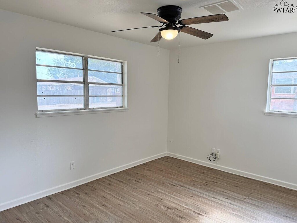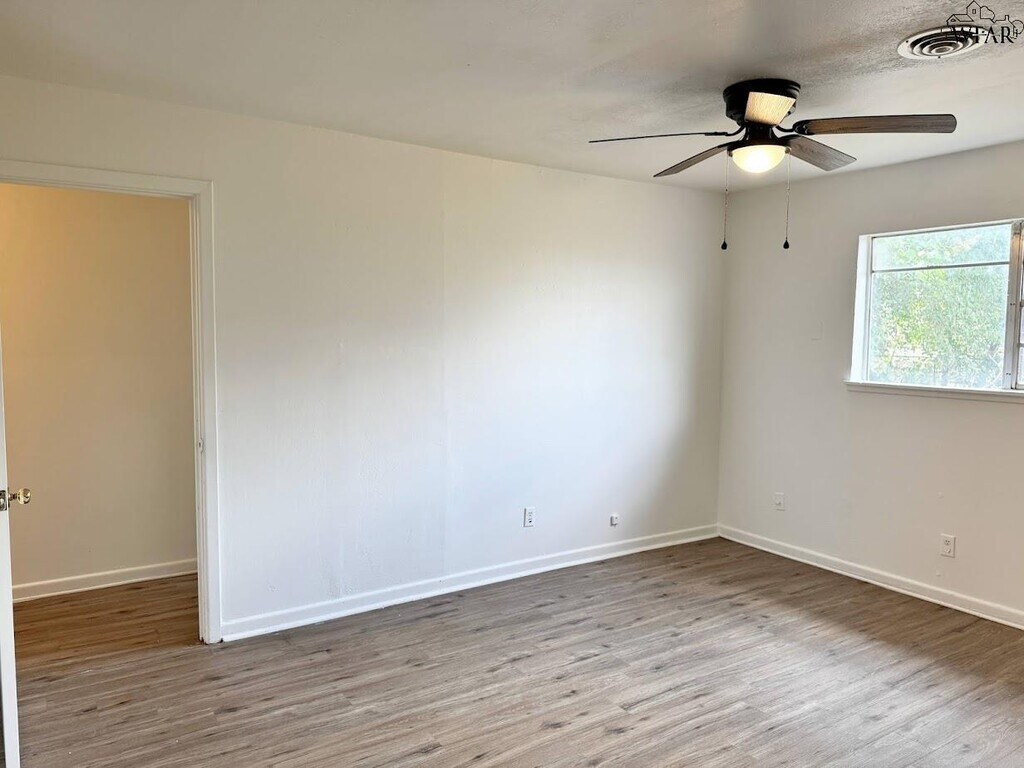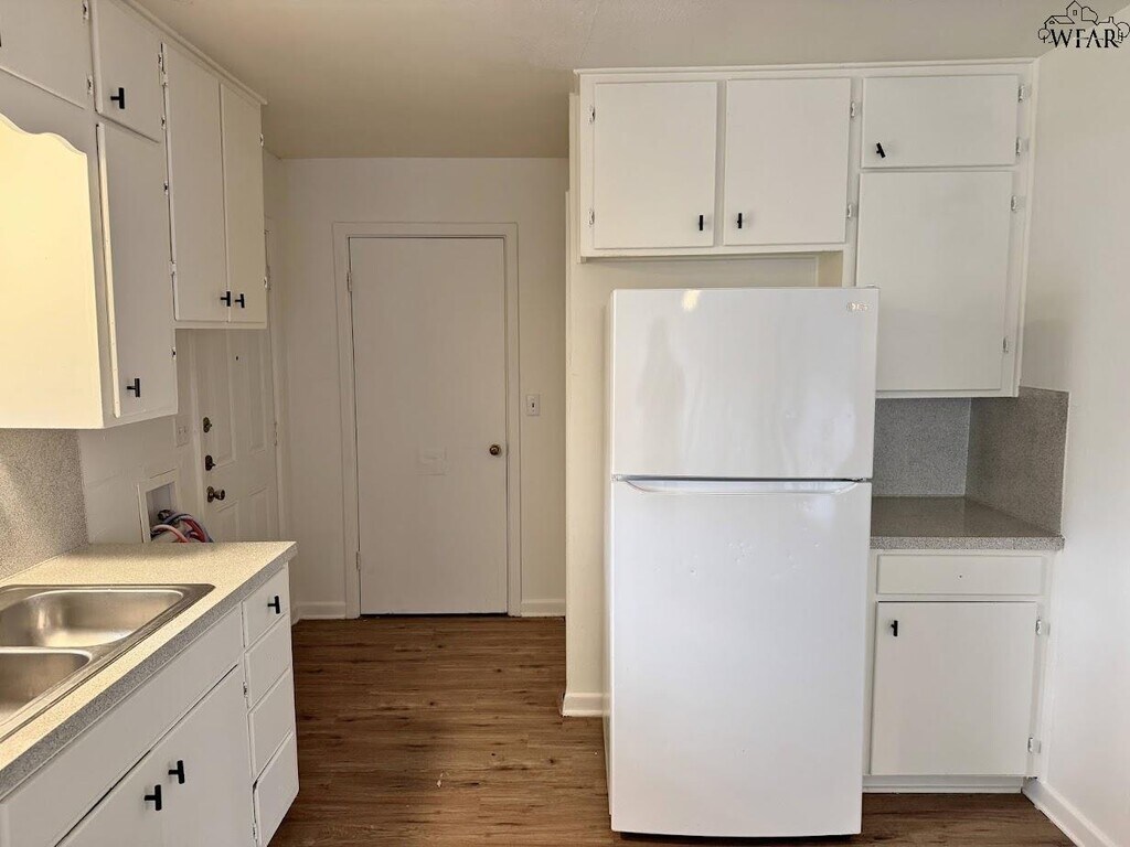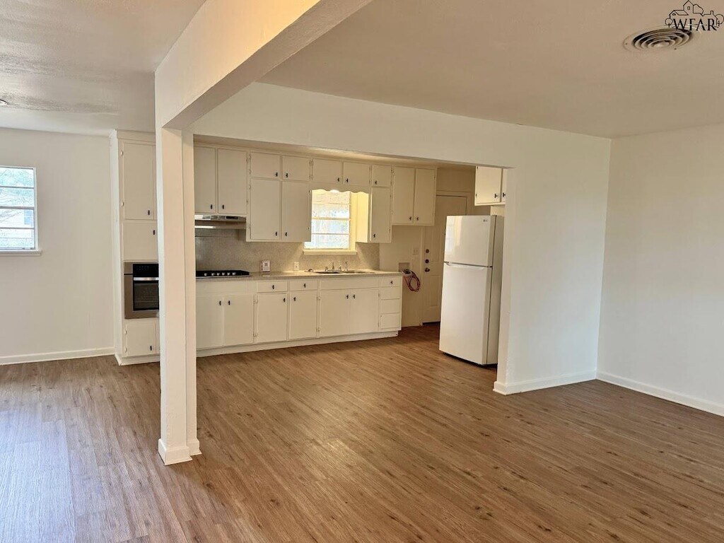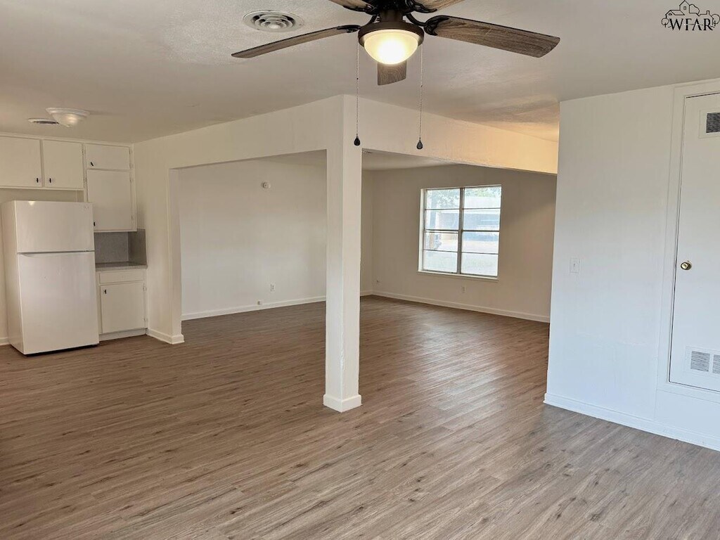 Welcome to 1001 W Beverly Loop, a charming 3-bedroom, 1.5-bathroom home located in Burkburnett, TX. This property has brand new paint throughout! Open kitchen, living, and dining area. Kitchen features plenty of cabinetry, a stovetop and built-in oven, a refrigerator, washer connections, and a pantry. Primary bedroom has a walk-in closet and en-suite half bath. Attached garage features a manual door, metal cabinetry, and the dryer connection. Large backyard is fully fenced with chain link.