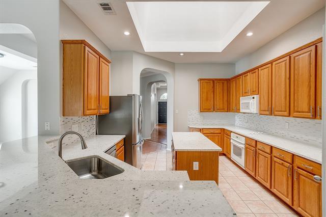 Beautiful ONE STORY home with highly rated KELLER ISD! This home has everything you dream about... Amazing OPEN FLOOR PLAN w 4 bedrooms, 2 living rooms and a spacious media room. HUGE KITCHEN with a lot of cabinets, beautiful granite countertops. Stainless refrigerator is included. LARGE MASTER BEDROOM with 2 separate closets and spacious master bathroom. Resort Style backyard with SWIMMING POOL, huge COVERED PATIO has a lot of privacy, green belt and mature trees. Great location! Elementary school in walking distance. Plenty of shopping and restaurants nearby. Close to Freeway I-35W and State Highways 114, 170, & 377. SHOWINGS WILL START ON August 16, 2025. READY TO MOVE IN. The landlord covers HOA fees and the swimming pool maintenance.