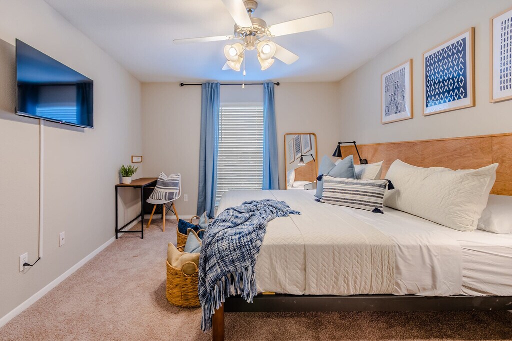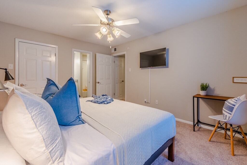 Welcome to a serene retreat designed for relaxation and comfort. This apartment offers a perfect blend of tranquility and convenience, located in a gated and well-lit complex. Ideal for small families or long-term stays, it features an in-unit washer and dryer, ensuring you feel at home. Enjoy the vibrant community and take leisurely walks with your furry friend, all while being minutes away from numerous restaurants and attractions. The apartment is equipped with everything you need for a comfortable stay. Interior features include built-in USB ports, stainless steel appliances, keyless entry, spacious closets, and quartz counters. Enjoy the fireside patio/lounge and a stunning pool within the gated complex. Free street parking and reserved spots are available. The unit welcomes you with smart lock entry into a spacious living area, complete with carpet and hardwood floors, ceiling fans, Wi-Fi access, and a Smart TV. The bathroom offers a shower with a full-sized tub and complimentary toiletries. The bedroom features a super comfort queen memory foam mattress, a cedar-lined closet, luggage racks, and plenty of outlets for your electronic devices. The fully equipped kitchen includes full-sized appliances, a microwave, coffee maker, toaster, blender, food processor, pots and pans, and basic spices for cooking. Pets are welcome with a pet fee per pet, with a maximum of $300 for long-term stays. Free street parking and reserved spots are available. This apartment is perfectly situated for those who love shopping and dining, with high-end shopping just steps away. It's only 0.3 miles from North Park Mall and 8 minutes from Galleria Mall, and just 10 minutes from downtown. The proximity to the Medical District makes it ideal for work travelers. The DART public transit is right next door, offering easy access to Downtown Dallas for sporting events, meetings, dinners, shopping, and concerts. Southern Methodist University is nearby, making this a fantastic choice for visitors to the school. Guests must agree to not disturb neighbors and observe quiet hours from 10 p.m. to 8 a.m. The home is monitored with decibel sensors for compliance with this noise policy. No smoking is allowed inside the property, with a penalty of $250 per day for violations. No parties are allowed, and a noise monitoring device is used to detect excessive noise levels. Lost door keys or remote fobs will incur a $150 replacement fee. All guests must be accounted for on the guest list, and any violation of house rules may result in immediate termination of the reservation without refunds. Packages are not allowed to be ordered to this location for privacy reasons, with exceptions for long-term stays. Guests are required to verify identity prior to accessing the property and must have a working phone number for emergencies. For long-term stays, a criminal background check is required, along with a $500 trust and safety hold, refundable after checkout. The apartment is remote work-friendly, featuring Wi-Fi access and ample outlets for all your electronic devices. A laptop computer is not included. [SI]