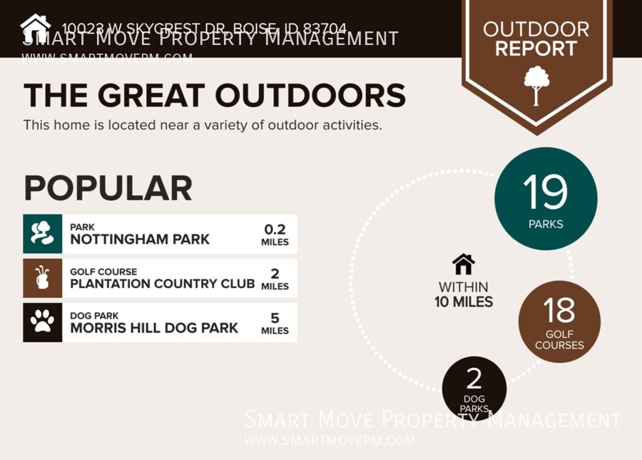 10023 W Skycrest Dr has 4 parks within 8.0 miles, including Camel's Back Park , The Basque Museum and Cultural Center, Roaring Springs Water Park, and Idaho Botanical Gardens.