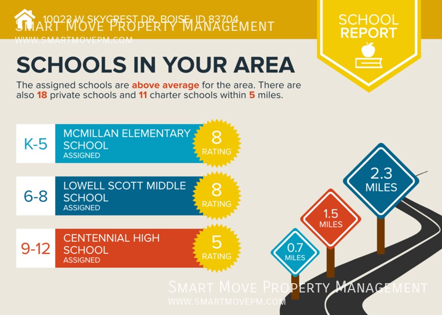 Adorable single level, 3 bed, 2 bath home in West Boise. Close to Hyatt Hidden Lakes Reserve. Walking distance to Skyline Park. Bright and open functional layout with living room and family room. Perfect for entertaining. Cozy wood burning fireplace. Washer/dryer hookups. Large fully fenced backyard with covered patio. Walkthrough video available on Smart Move PM website TERMS: Rent: $1995 Security Deposit Refundable OAC: $1995 Leasing Administrative Service: $150 Lease Term: 6 months Application Processing: $45 per adult Pets: Max 2 pets negotiable. Pets under one year of age will not be considered. Pet Rent: TBD ($35-$45 per pet/mo) Pet Acceptance Charge: TBD Utilities Paid By Tenant: all utilities Lawn maintenance: Tenants Roommates: Max 3 Renters Insurance required Resident Benefits Package required with ALL lease agreements under Smart Move Property Management. The $35 monthly bundle includes: Renters Insurance - $10k personal content plus $100k liability, Pest Control, Furnace Filter Home Delivery, Bi-Annual Repairman Visit, 24/7 Emergency Live Answer call line, Resident Portal. Schools (subject to verification by applicant): Centennial High School, Lowell Scott Middle, McMillan Elementary Property listing information is deemed reliable but not guaranteed. Applicant is to verify all information. Only apply through the Smart Move PM website: