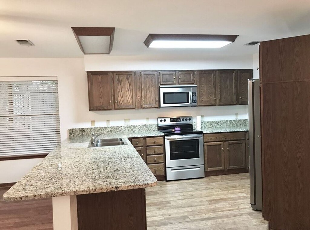 FOR LEASE – 3 Bedroom, 2 Bath Home with Modern Finishes and Functional Design FOR LEASE: Well-maintained and thoughtfully designed, this home features a split floor plan that offers both comfort and privacy. The open-concept layout connects the kitchen, dining, and living areas, creating a bright and inviting space ideal for everyday living. The kitchen is equipped with stainless steel appliances, granite countertops, and ample cabinetry. The primary suite includes a large window providing natural light, a spacious walk-in closet, and a private bath. Additional features include faux-wood flooring in the main living areas, carpeting in all bedrooms, and a two-car attached garage. The covered back patio overlooks a beautifully landscaped, shaded yard—perfect for relaxing or entertaining.