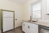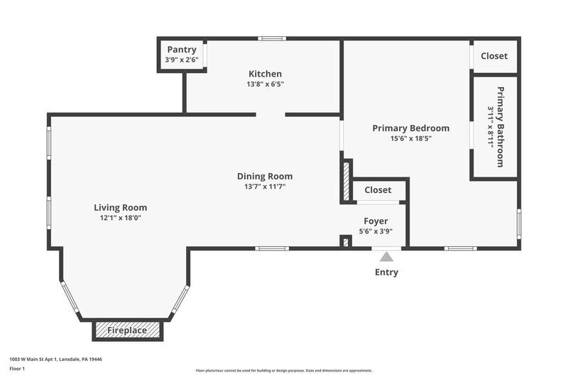 Located at the corner of Main Street and West End Drive, this thoughtfully updated 1st floor apartment blends classic character with everyday comfort. Real hardwood floors run throughout the combined living and dining area, which is filled with natural light and features a cozy fireplace at the front of the unit. The kitchen is compact yet well laid out, with tiled flooring, standard appliances including a dishwasher, ample cabinet space, and a pantry for additional storage. Toward the back of the unit, the bedroom includes a ceiling fan, a closet, and a separate nook. Ideal for a desk or small workspace. The en-suite bathroom features a tub/shower combo with a tile surround that extends along the perimeter. The property also includes a large front yard with manicured landscaping and a driveway for additional parking (one space included). A coin-operated laundry is available in the basement for added convenience. Cats and small dogs are allowed with an additional fee (breed restrictions apply) Tenant is responsible for electricity plus a $75/month utility fee (gas, water, sewer)