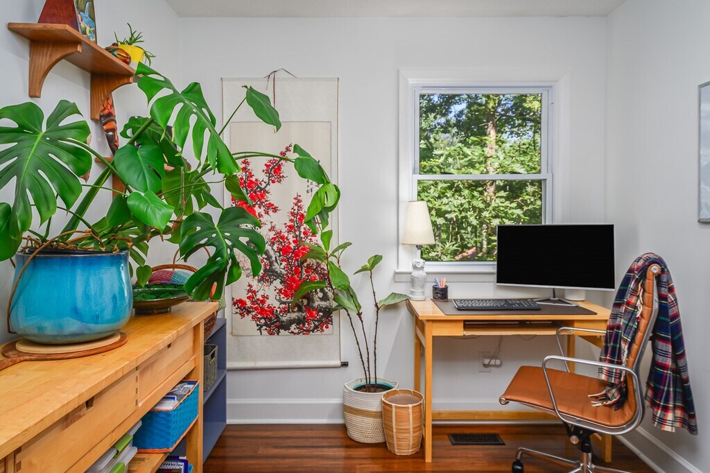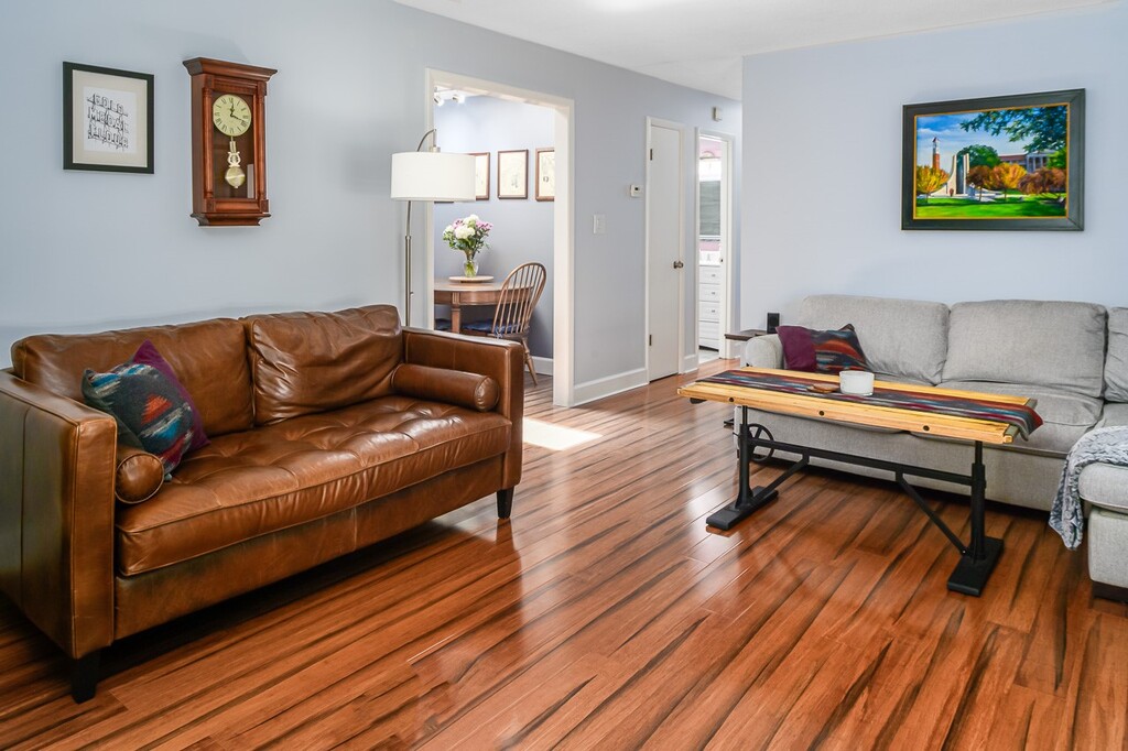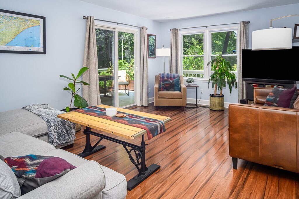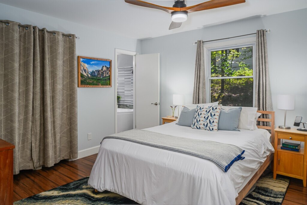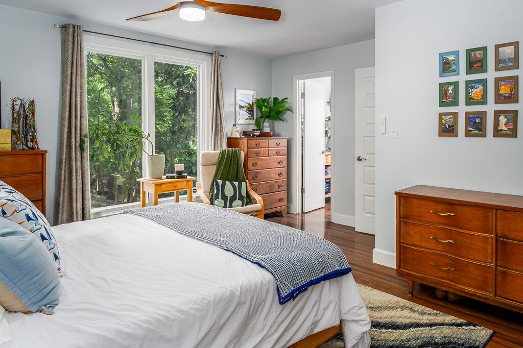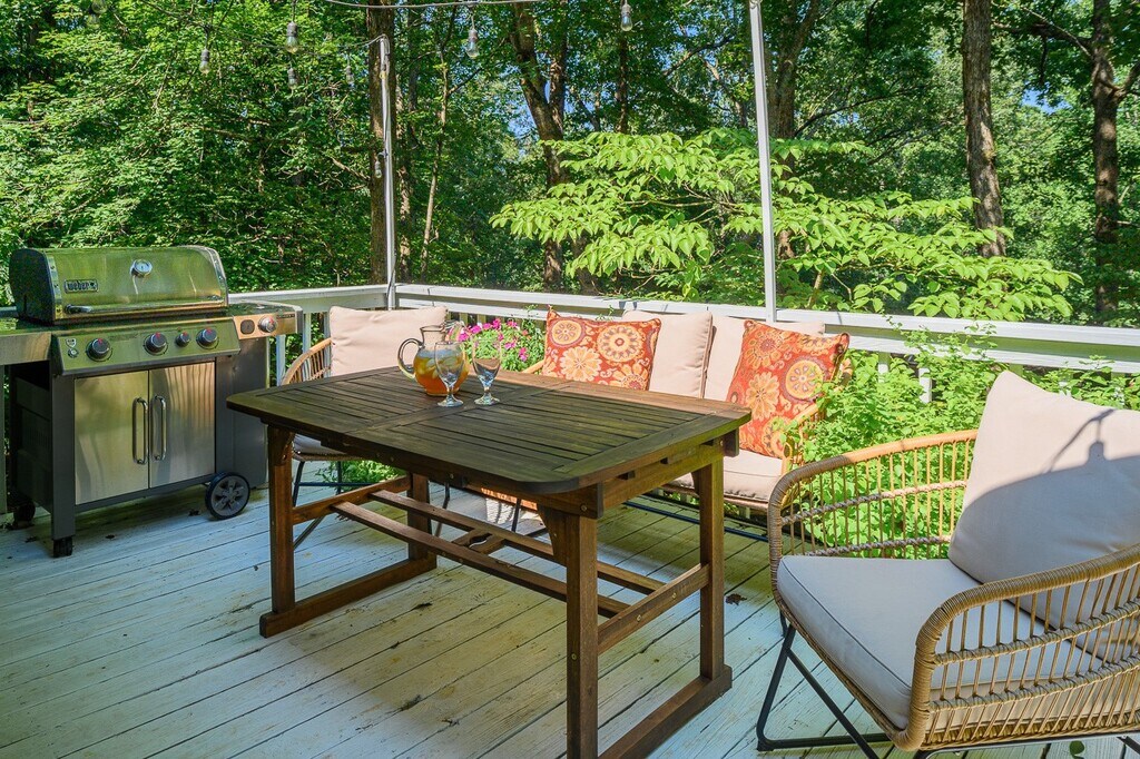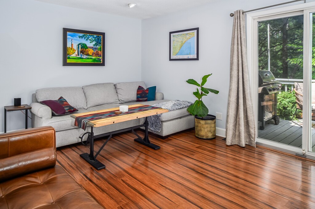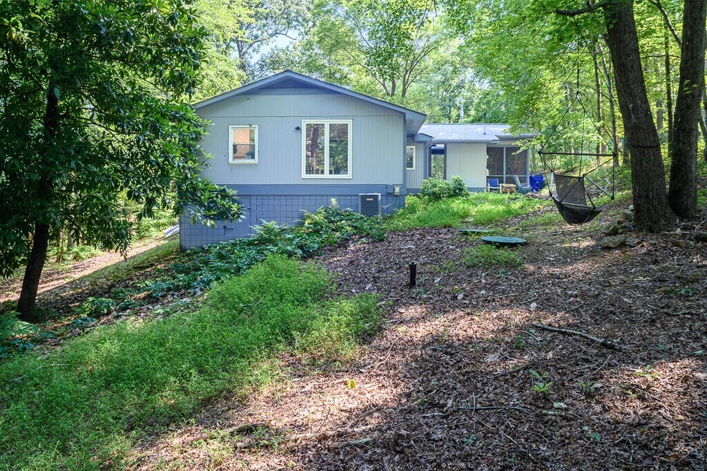 Fully furnished home, nestled atop a large hill - this quiet property provides the ultimate private retreat. Surrounded by towering trees and lush gardens, enjoy breathtaking views from your treehouse-like deck and the tranquility of nature, all just a five-minute drive from UNC's vibrant main campus and a short commute to Research Triangle Park. Discover a freshly renovated space boasting a modern yet cozy atmosphere. The furnishing package includes everything you need, including a fully equipped kitchen. Just bring your suitcase!Sustainable bamboo floors flow throughout the comfortable floor plan and are offset by expansive windows and skylights that flood the home with natural light. The state-of-the-art kitchen is a chef's delight, with stainless steel appliances, granite countertops, and ample maple cabinetry. Whether whipping up a gourmet meal or enjoying a casual breakfast, this kitchen is functional and beautiful. A full laundry room, pantry, and numerous closets make this a home where everything has its place. The attached carport and large driveway boast parking for multiple vehicles. It is also walking distance from Southern Village dog park, frisbee golf course, walking trails, Weaver Street Co-Op, and Al's Burger Shack! Located within the Chapel Hill Carrboro School district, it is walkable to the UNC bus system stop and bikeable to campus.