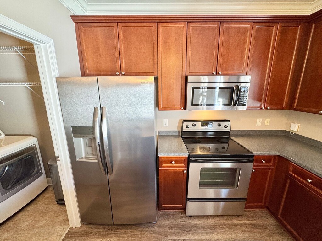 Townhome with 3 bedrooms and 2.5 Bathrooms in desirable Lenox Village neighborhood. Primary suite features vaulted ceiling, walk-in closet, double vanity, and oversized tub/shower. First floor features a large living room, dining room, 1/2 bathroom, kitchen and laundry (washer/dryer included). Fenced patio and detached 2 car garage. The three bedrooms are on the second floor. Wood-look flooring on first floor and carpet on second floor. Walk to shops and restaurants in Lenox Village.