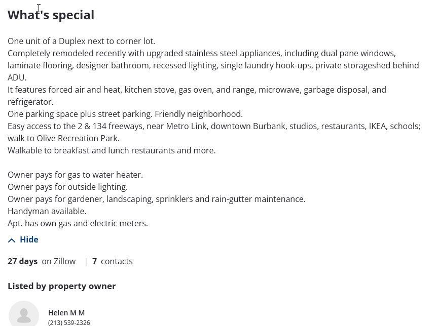 Remodeled duplex with stainless steel appliances and washer and dryer hook-ups, dual pane windows, recessed lighting, laminate floor, and storage in back. Forced air and heat, stove, oven microwave, garbage disposal, and fridge. One parking space designated. Close to Olive Recreation Park, restaurants, shopping, schools, Providence Hospital, and very walkable to entertainment hubs. Owner pays for water, outside electicity, gardener. Quiet, safe neighborhood.