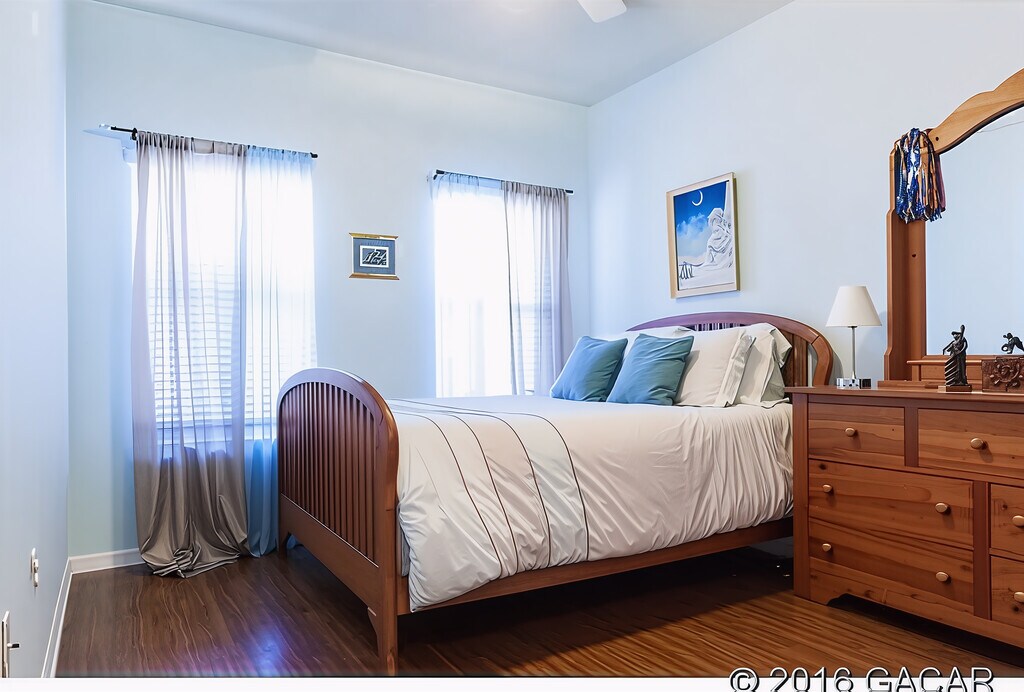 Welcome to 10051 NW 22nd Rd – a beautifully designed 4-bedroom, 2-bathroom home located in one of NW Gainesville’s most sought-after neighborhoods. This thoughtfully laid-out home combines comfort, style, and practicality — all just minutes from the University of Florida, Town of Tioga, Jonesville, and the Oaks Mall shopping and dining district. Key Features: Open-Concept Living: The spacious living room features an open kitchen design with a dedicated dining area, creating an ideal layout for both everyday living and entertaining guests. Every inch of the home has been thoughtfully utilized to maximize space and flow. Built-In Living Room Speakers: Enjoy immersive sound with in-ceiling surround speakers — perfect for movie nights or music throughout the day. Modern Kitchen: Boasts sleek countertops, ample cabinet space, and all major appliances including a refrigerator, stove, and dishwasher. Designed for functionality and ease of use. Spacious Bedrooms: This home features four generously sized bedrooms, each with its own closet and plenty of natural light. Ideal for families, roommates, or those needing a home office or guest space. Master Suite Retreat: The primary suite includes a large walk-in closet and a private bathroom with modern finishes — a peaceful retreat to unwind at the end of the day. boasting a Jetted Garden tub, a Double sink vanity, and a Walk-in shower Private Backyard: A fully fenced yard offers the perfect outdoor space for relaxing, gardening, or entertaining. Two-Car Garage: Provides secure parking and additional storage space. Efficient Use of Space: Designed to make the most of every square foot, this home lives larger than its size and offers excellent functionality throughout. Top-Rated School Zoning: Zoned for some of Gainesville’s best elementary and middle schools, all located within walking or biking distance — perfect for families who value convenience and quality education. Community amenities include swimming pool, play area and well paved sidewalk for pleasant walks. Utilities, Internet and cable are tenant's responsibility- Tenants are expected to adhere to strict no smoking policy inside the home-