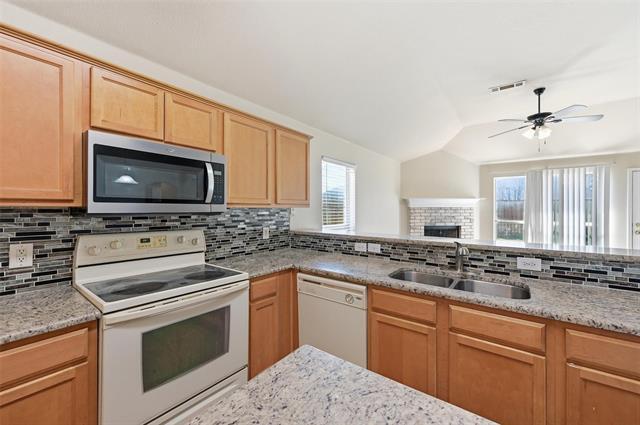 Inviting 4 Bed 2 Bath Home! Enjoy rich hardwood floors throughout foyer and formal dining room and dark tiled floors in the living area and eat-in kitchen. Warm up in the colder seasons with the brick fireplace and large windows for natural light. The kitchen features decorative backsplash and granite counters with an island for additional prep space. Ceiling fans throughout the home for energy efficiency. Each bedroom offers plush carpeting and the guest baths have adequate size vanities and linen cabinets. The master bath provides a separate shower and dual vanity. Backyard hosts tons of greenery and is surrounded by mature trees. Pets: Case by Case