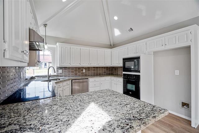 Beautiful 4-bedroom, 2-bath home boasting high custom ceilings and two spacious living areas, including one with a striking fireplace. The home features waterproof vinyl flooring throughout and a stylish kitchen complete with elegant countertops, modern backsplash, refrigerator, and all included appliances. A washer and dryer are also provided for added convenience. Charming shutters, gorgeous light fixtures, and abundant closet space add comfort and character throughout the home. Step outside to a large backyard ideal for gatherings, relaxation, or play. A convenient 2-car garage offers additional storage and functionality. This home has everything you need—comfort, style, and space inside and out.
