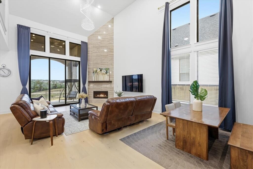 Welcome to this wonderful Highland Home with no rear neighbors! This north facing home has 5 bedrooms, 4.5 bathrooms, 3906 sq ft and a 3-car garage (has EV charger). The residence boasts a thoughtful and spacious layout, perfect for modern living. The home is on a 70 ft lot and feeds into Leander ISD. The soaring living room with a stunning chandelier is a wow factor! The home features two living spaces, providing ample room for relaxation and entertaining. The open concept living features a lot of windows and great natural light. The main living area is anchored by a striking floor-to-ceiling fireplace, creating a cozy focal point. The gourmet kitchen is a chef's dream, featuring an oversized island with seating, gorgeous brown and gray cabinets, a large expansive island & stainless-steel appliances. The primary bedroom is a serene retreat with a large bay window and an en-suite bathroom that includes a dual vanity, a spacious walk-in shower, and a luxurious freestanding tub. The primary closet is attached to the laundry room, simplifying your laundry duties. The primary bedroom, another bedroom/full bathroom plus a half bathroom are downstairs with 3 bedrooms, 2 full bathrooms upstairs. A dedicated media room downstairs offers an ideal spot for movie nights. There is a spacious home office with double doors and built in shelving at the front of the home. Step outside to the covered back patio, perfect for al fresco dining and enjoying the large, private backyard with no rear neighbors. Community amenities include an amenity center, covered pavilion, pool, pickle ball courts and hiking/biking trails. The community’s ideal location off FM 2243 near Ronald Reagan Blvd. offers easy access to major thoroughfares including 29, 35, 183A, and 130, making commuting to north Austin, downtown Georgetown, Cedar Park, and other Central Texas destinations convenient. Includes refrigerator, washer, dryer and Epson projector in the media room. Tenants need to verify the school. MLS ID 8128263