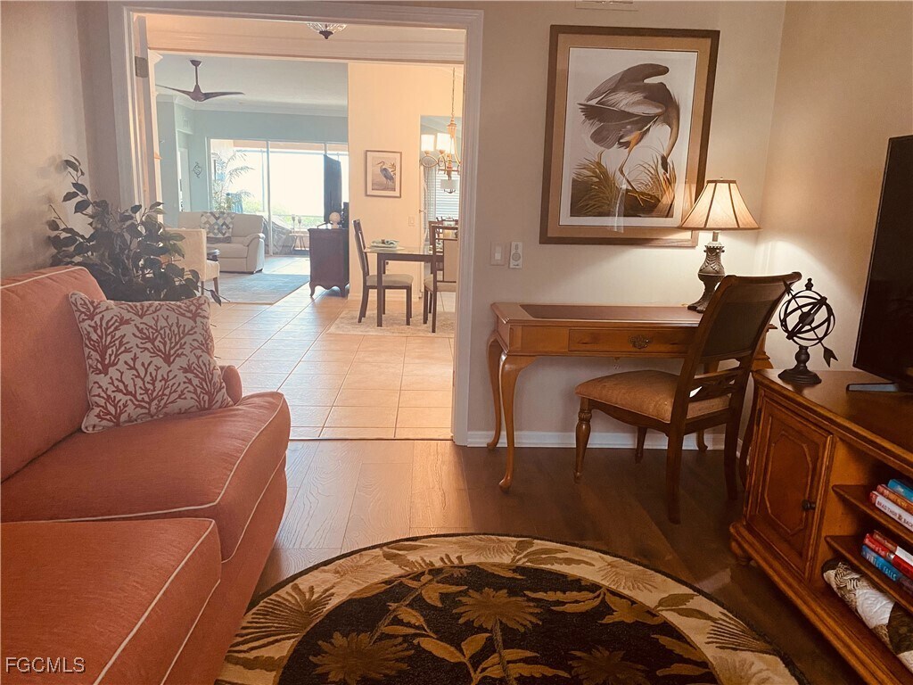 AVAILABLE NOVEMBER AND DECEMBER. You have a gorgeous view of the golf course and lake off your lanai in this beautiful fully furnished 2 bedroom,2 bath with den villa in the golf community of Colonial Country Club. This villa is on the corner with an oversize lot,and views from every angle. Colonial Country Club has all the amenities you are looking for including tennis,golf,pickleball,bocce,pools throughout,a beautiful dining room and clubhouse and much more. Don't miss out spending your vacation in this spacious home.