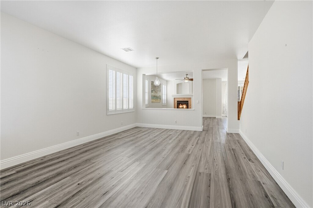 Beautiful 4 bed / 3 bath home near Summerlin with pool & spa! Spacious open floor plan with newer plank flooring downstairs and newer carpet upstairs. Full bedroom and bathroom on the first floor. Multiple living areas including living room, dining room, and family room with cozy fireplace. Kitchen features granite countertops, breakfast bar, pantry, and nook overlooking the backyard. Large loft upstairs. Oversized primary suite with walk-in closet and remodeled bath with tiled shower, separate tub, dual vanity, and makeup area. Secondary bedrooms include ceiling fans. Backyard offers covered patio, artificial turf, built-in BBQ, and relaxing pool & spa with no neighbors behind. Oversized 2-car garage with sink.