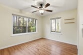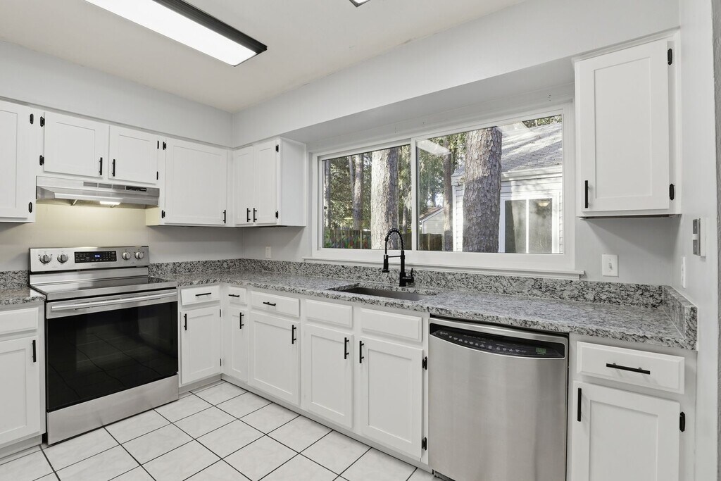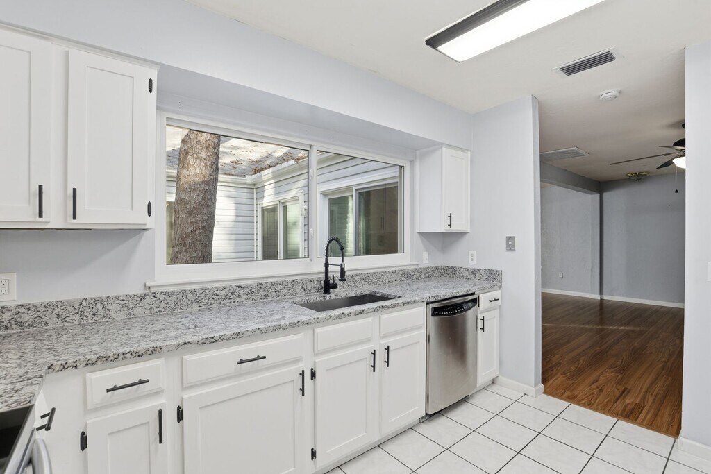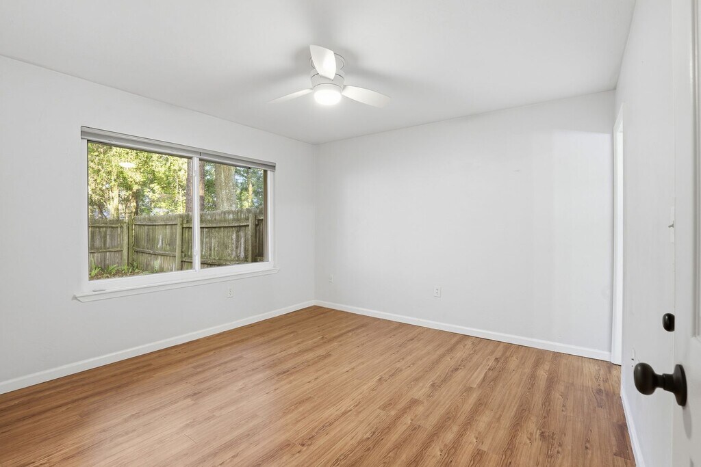 This move in ready 3 bed 2 bath home is only minutes to UF and close to downtown. It features beautifully remodeled bathrooms and an updated kitchen with lots of beautiful white cabinets, refrigerator, electric range/oven, dishwasher and a countertop microwave (not warranted). The living room has a vaulted ceiling and two glass sliding doors that overlook the backyard. The primary bedroom has two closets, the primary bathroom has a double sink vanity and lots of cabinets with a tub/shower combination. There are ceiling fans and window treatments throughout. Washer and dryer (not warranted) are located in the two car garage. Fully fenced backyard. Re-roofed (2010), laminate flooring (2010), storm rated windows (2015), freshly painted (2020). Enjoy this wooded lot, as well as the nearby Oakview Park. This NW neighborhood close to breweries, restaurants, and only 1.1 miles to UF. The tenant is responsible for lawn care and pest control. This home welcomes dogs only. No cats. Two maximum with a $250.00 non refundable animal fee per animal. To schedule a tour, please call or visit our website at