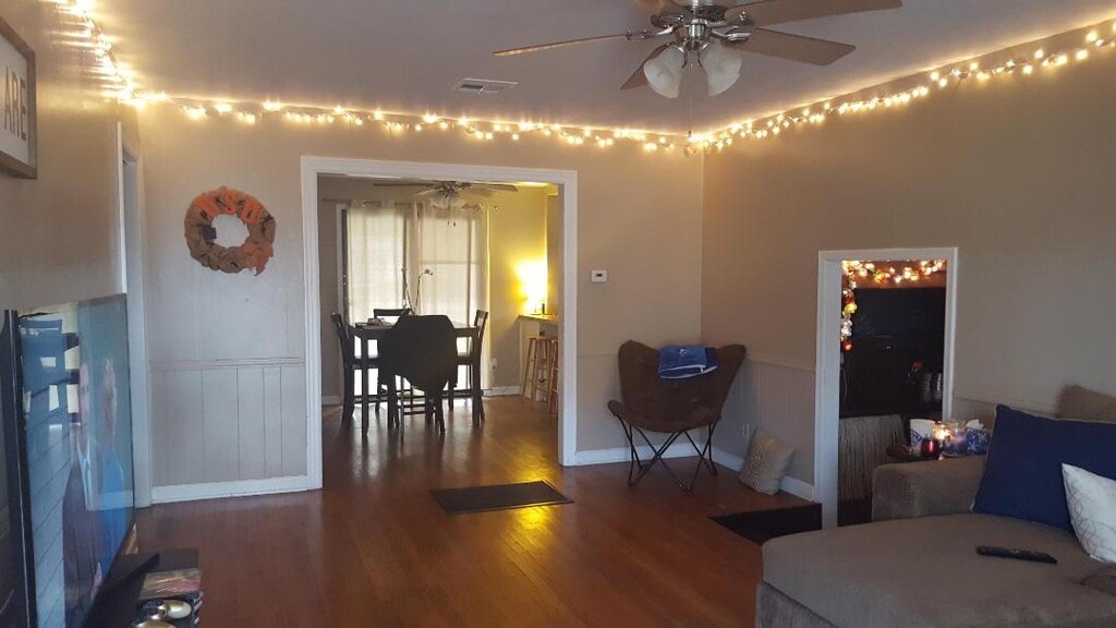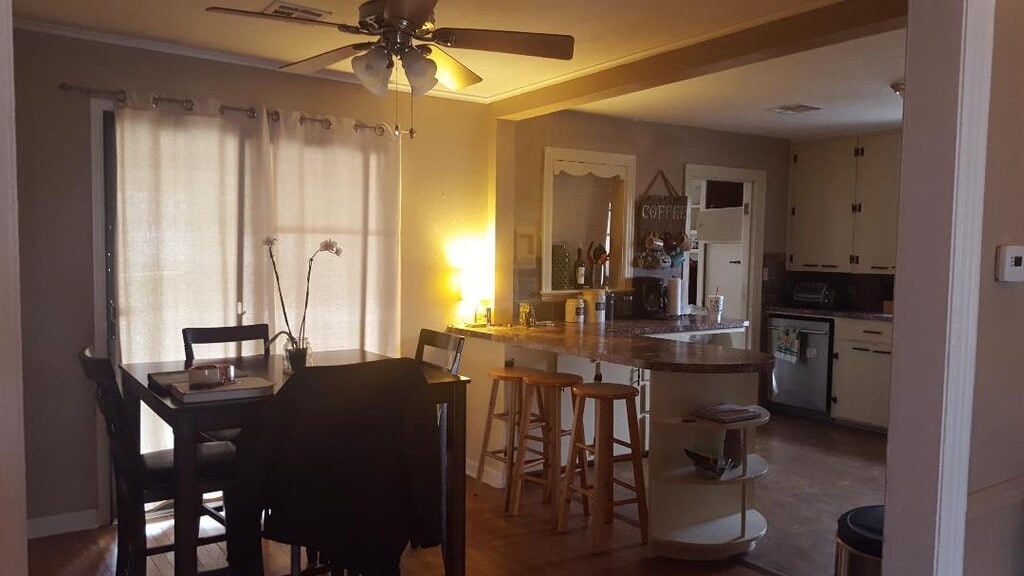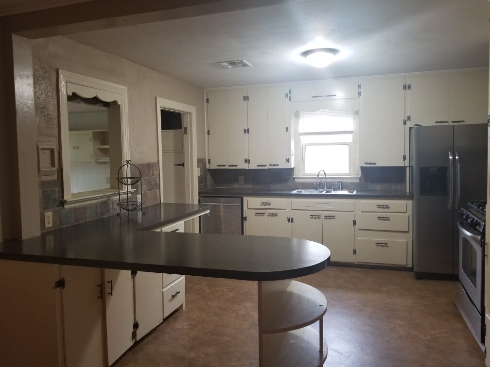 2-3 Bedrooms, 1 Bath. This is a large 2 bedroom with 2 living rooms and a separate office, or 3rd bedroom. This property has 2 bedrooms downstairs with a bath in between, with a 3rd bedroom or office above the 2nd living room. Very nice craftsman style house, completely remodeled and updated including new central heat and air. Most of the house has wood floors, with new carpet in 3rd bedroom/office and the 2nd living room. The 2nd living area also has a fireplace and built in bar with counter. It has all new stainless steel appliances including dishwasher with new countertops and flooring in the kitchen. The bathroom has been updated with tile and new fixtures (not pictured). There is an underground tornado shelter in the laundry room where a washer and dryer is included. There is a screened in porch on the back of the house. No Pets are permitted and utilities are not included in the rent
