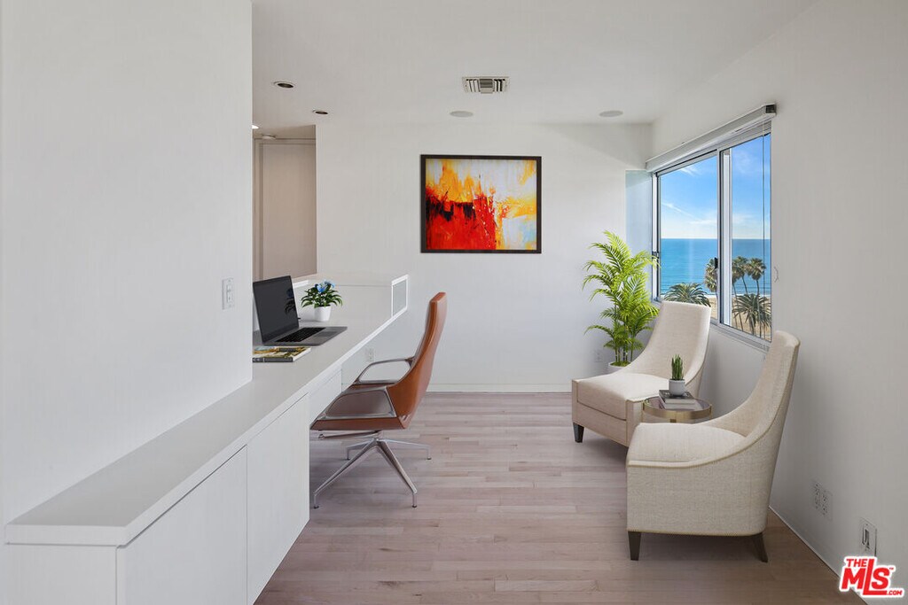 Experience the best of Santa Monica living along the highly coveted Ocean Avenue. This open concept corner unit boasts some of the best views around from magical coastline and sunsets to snow capped mountains in the winter from nearly every angle. Originally a 2 bedroom unit that has now been opened up to a large 1 bedroom + office/den it could easily be converted back into 2 if one needs. An updated kitchen with breakfast bar opens to the dining area with custom built-ins. A spacious living room gives way to ocean views, a private balcony, and a custom office nook. The primary suite offers another incredible view and plenty of closet space. All of this in close proximity to the best of Santa Monica - including world class dining, shopping, entertainment, farmers markets, fitness studios, parks, and the beach! Also available for sale at $1,675,000. MLS# 25603959